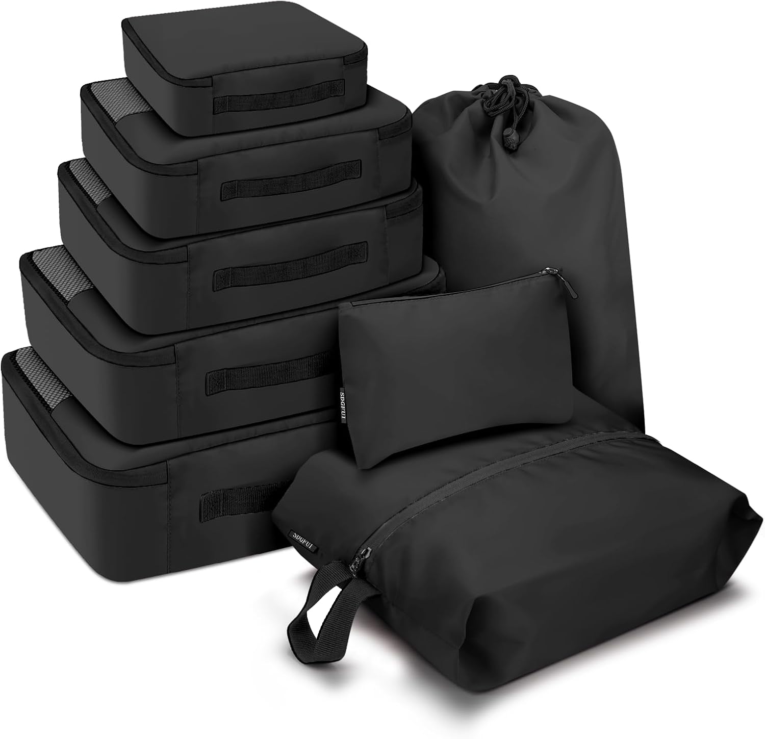 - More Space, More Convenience: Our packing cubes set includes 3 single travel cubes for clothes, 1 cube for underwear, 1 drawstring bag for dirty laundry and cosmetics, 1 makeup bag for toiletries, 1 shoe bag, and 1 small bag for socks, coins, pens, keys, and more. Keep your luggage neat and organized for an easy and comfortable travel experience.