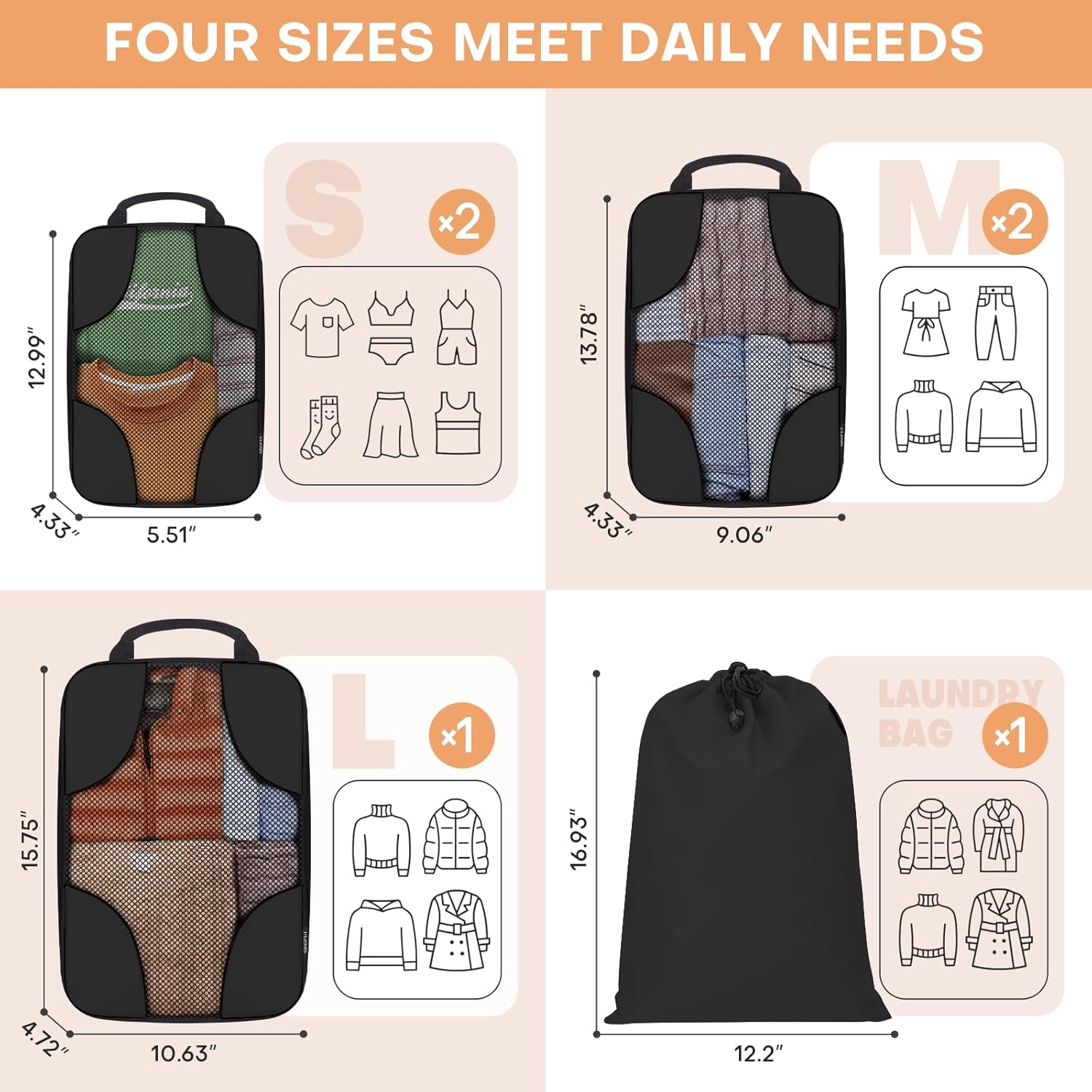 6 Set Compression Packing Cubes Bags for Travel Women, Compression Bags Organizer for Packing Luggage Space Saving, Suitcase Organizer Bags Set for Travel Essentials - Black