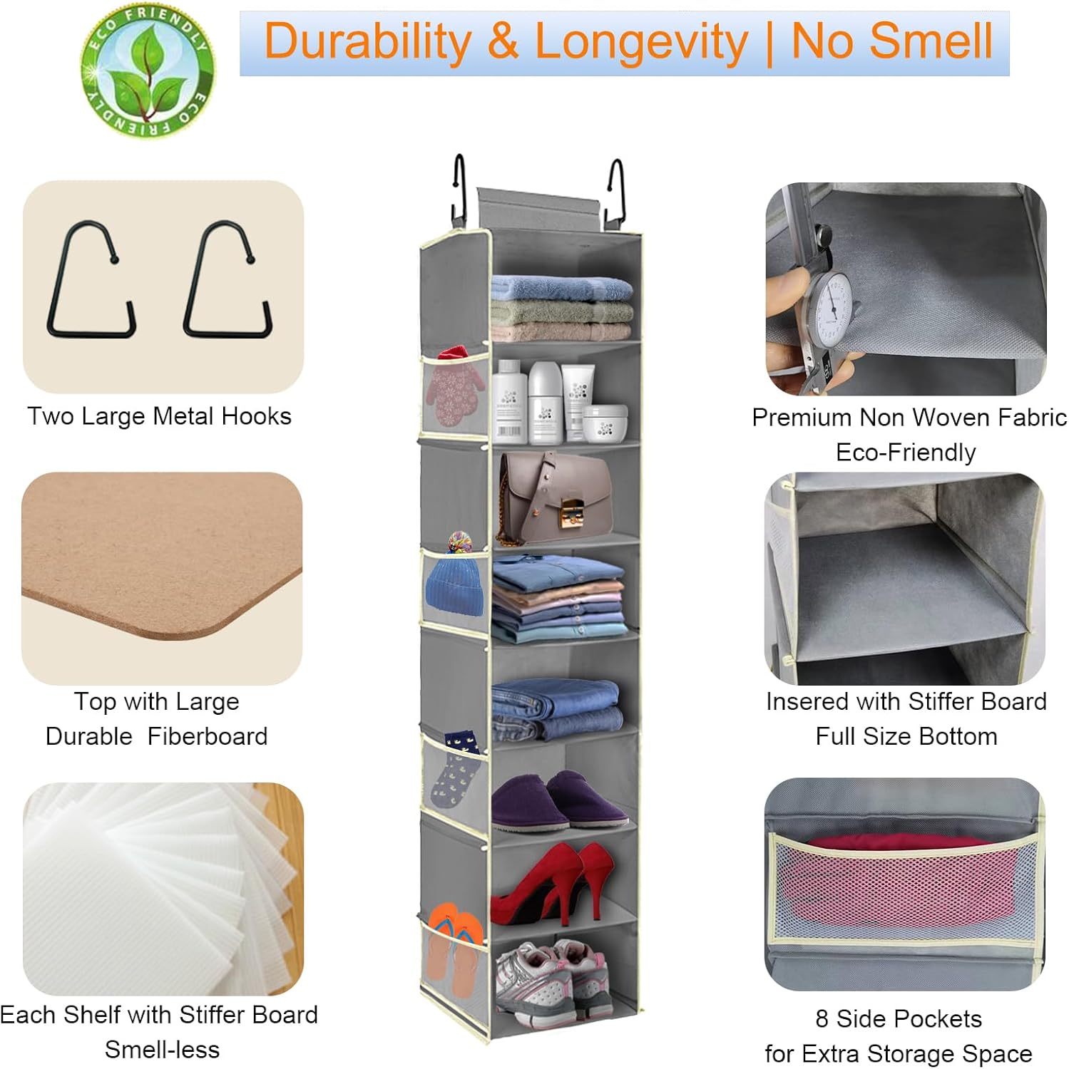- 【High Quality 】- The 8 shelves colset organizer and storage is made Eco-friendly heavy duty fabric is compatible with moisture-proof, tear-resistance, smell-less and breathable. Firm stitching is exquisite, each storage shelf has inserted with durable stiffer board smell-less, a particular fiberboard on the top to ensure you the high level strong quality.