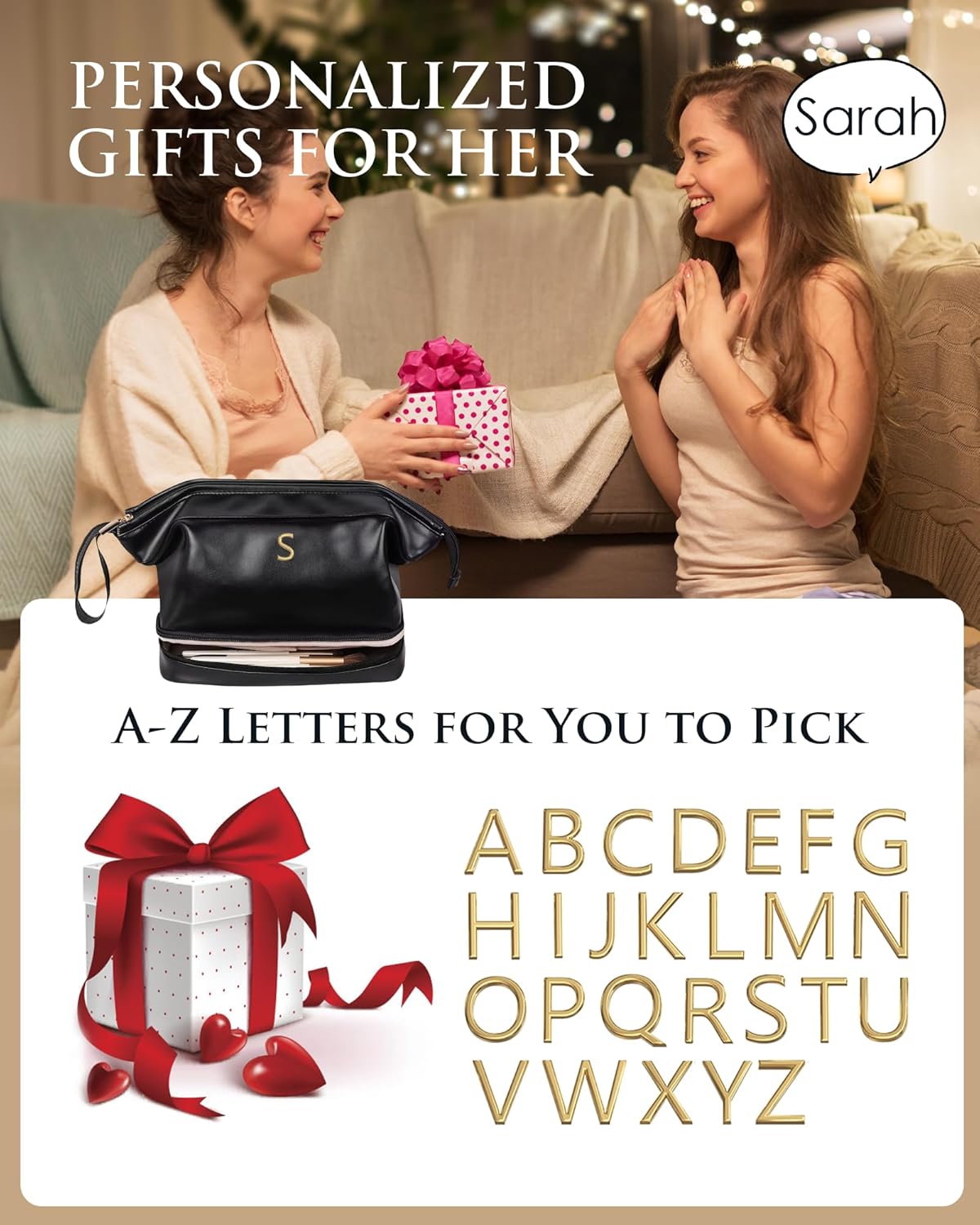 Birthday Gifts for Girls, Initial Large Makeup Bags, Personalized Double Layer Cosmetic Bag with Makeup Brush Organizer,Toiletry Bag, Gifts for Women Girlfriend Friends Female Mom Sister