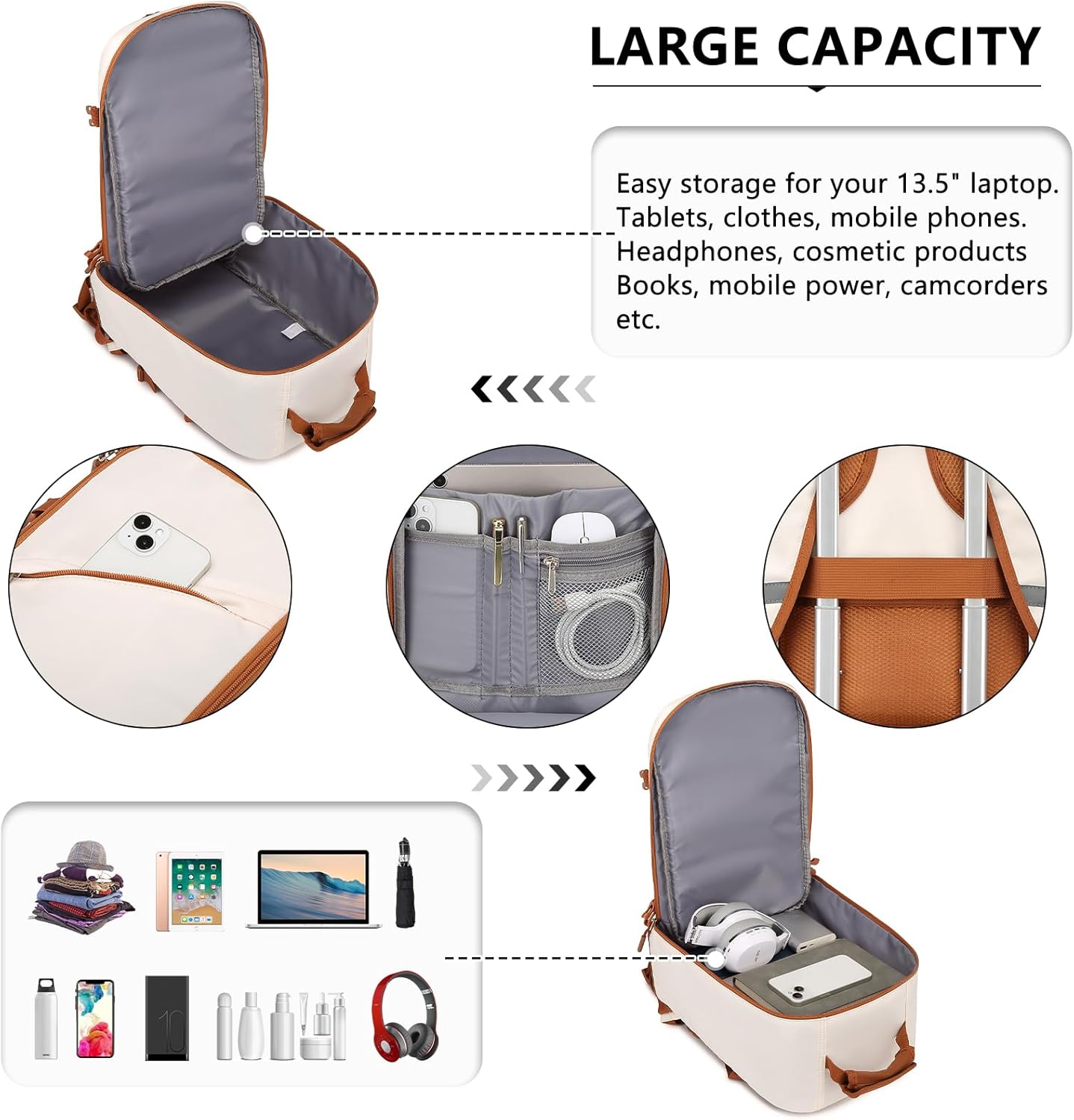 Kono Carry on Backpack, 16" Airplane Approved Under Seat Travel Backpack for Men and Women, Waterproof Lightweight Daypack for Flight 20L, White/Brown