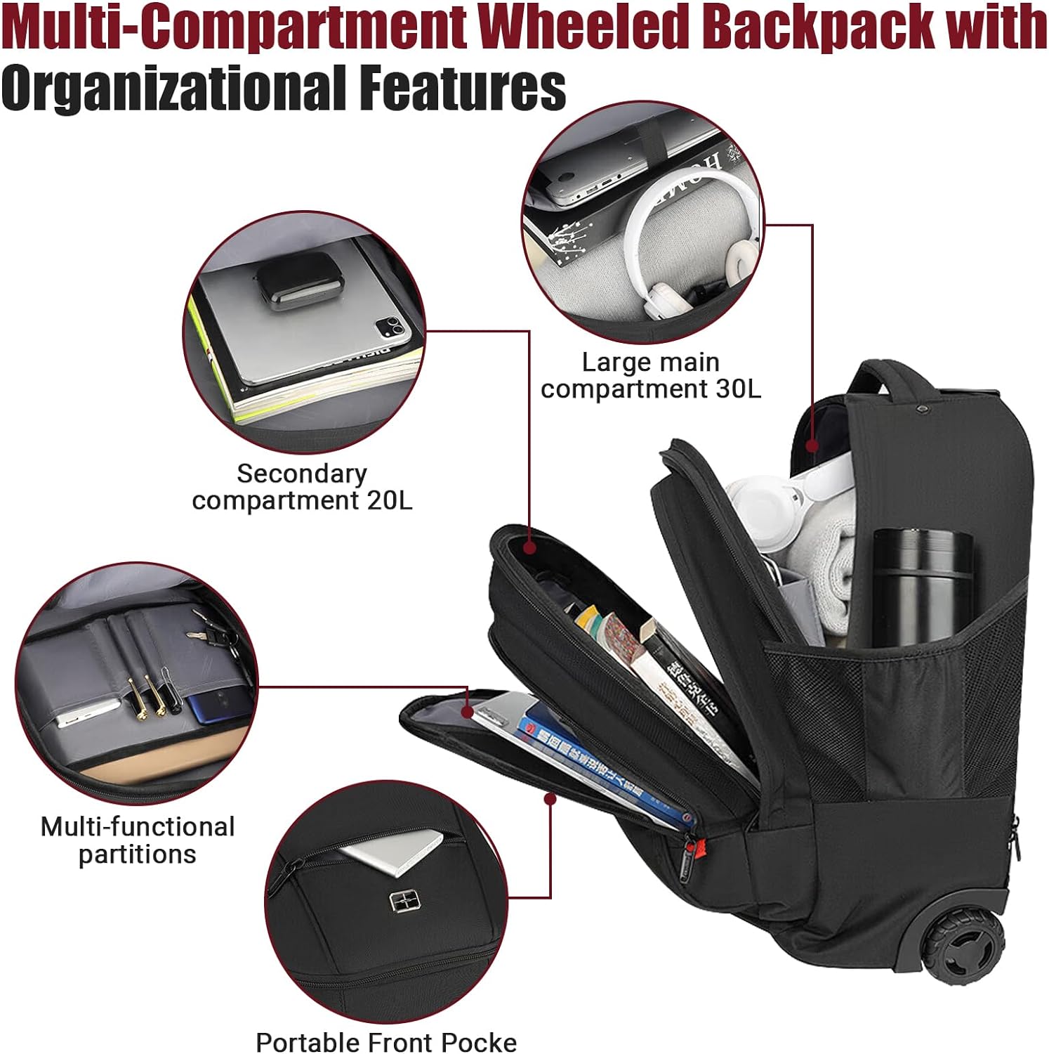 - 2 WHEELS DESIGN: Streamline your travel with the innovative two-wheel design of this backpack on wheels, minimizing the footprint while maximizing storage space compared to four-wheel counterparts. The durable trajectory of the inset wheels reduces damage and ensures steady navigation over varied terrains, making it a reliable lightweight rolling backpack.