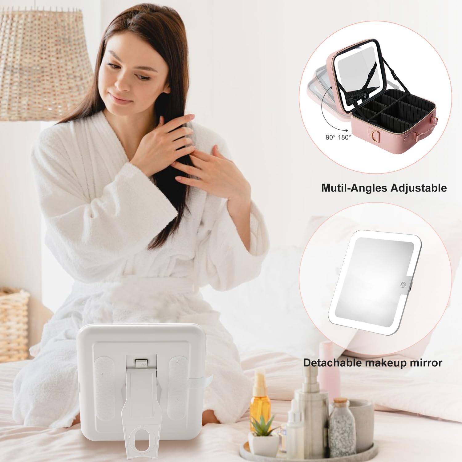 - 💄【Removable & Adjustable brightness High Definition LED mirror】:3 lighting modes and 0-100% adjustable brightness that can be switched. With a long press on the switch, and a short press can adjust the color temperature between cool, natural and warm light.The makeup mirror is firmly attached to the makeup bag by Velcro and can be disassembled for separate use, and the makeup mirror comes with a separate stand that can be conveniently placed on the table according to your needs.