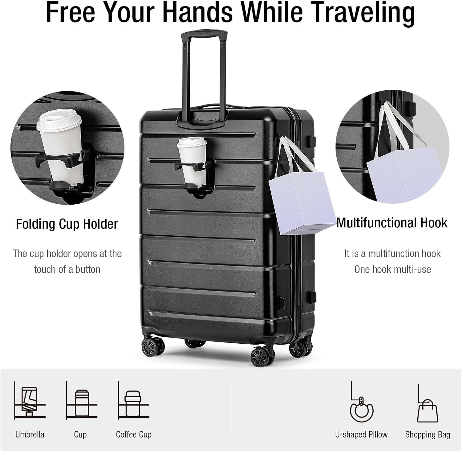 - Luggage Sets with Cup Holder:Especially designed water/coffee cup holder and multifunctional hook for umbrella or bag hooking.best luggage 2025 for your travel,college,family trip or gift choice