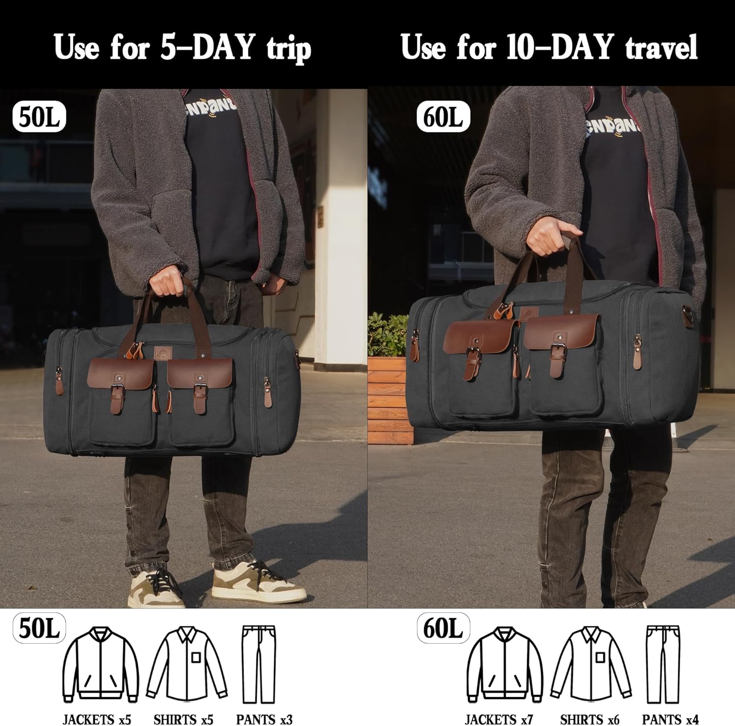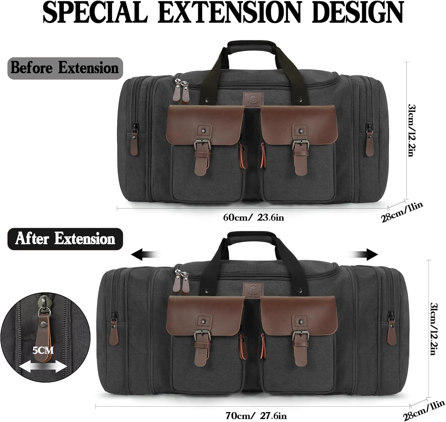 Canvas Duffle Bag for Men 60L Travel Duffel Bags Expandable Genuine Leather Duffel Overnight Weekender Carry On Bag Two Zipper Pockets Travel Bag (Black, X Large-60L)