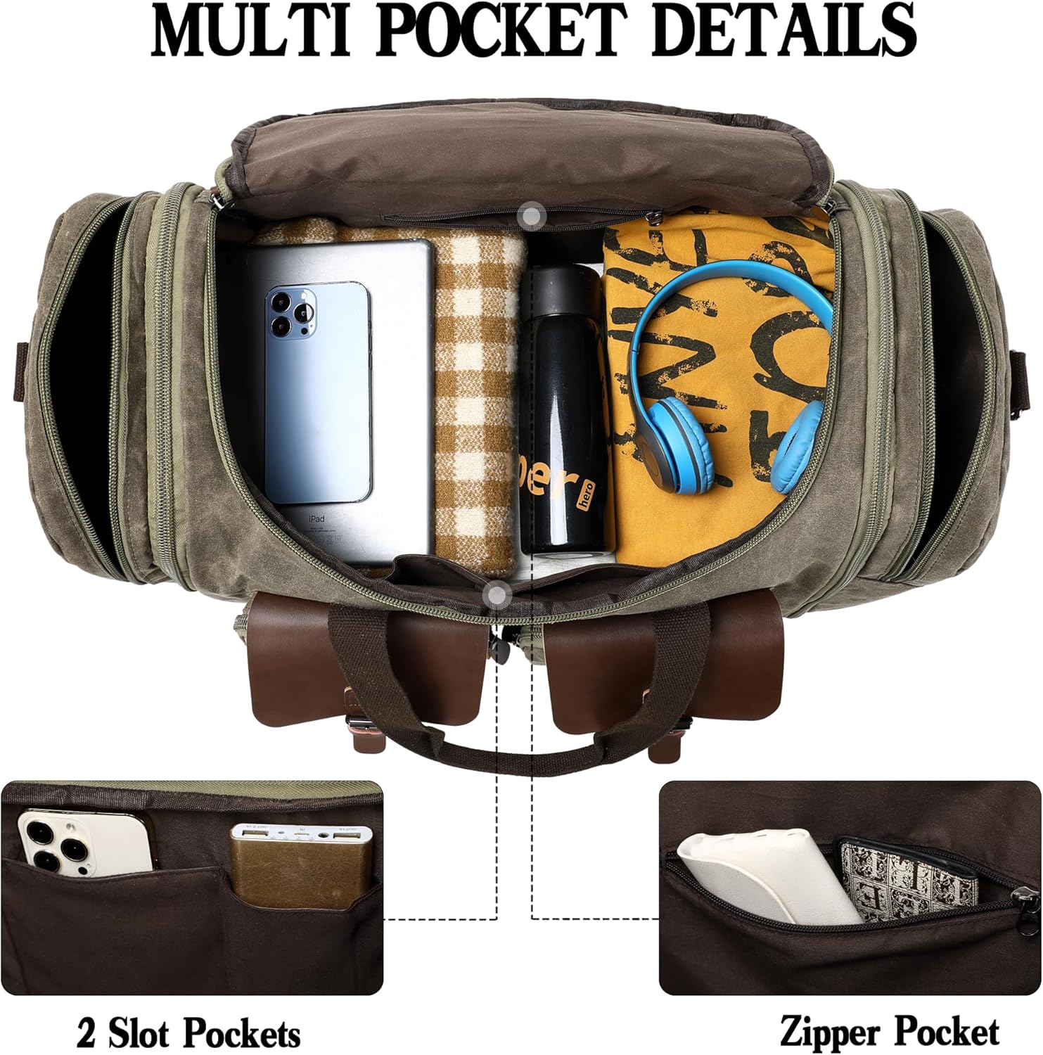 - 【Multi pocket 】The travel duffel bags have double genuine leather pockets on the front, connected with magnetic snaps for quick access to essentials. The design of duffle bag is a main compartment, 2 front pockets, 1 back zippered pocket, 2 side pockets. For easy storage, there is a large zippered pocket and 2 slot pockets inside the travel bag.