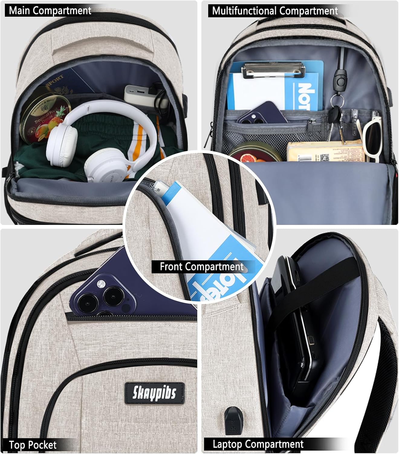 Travel Laptop Backpack for Women, School Backpack with USB Charging Port,Water Resistant Backpack for Girls, Business Work College bookbag,book bag Fits 15.6 Inch,Beige Back Pack