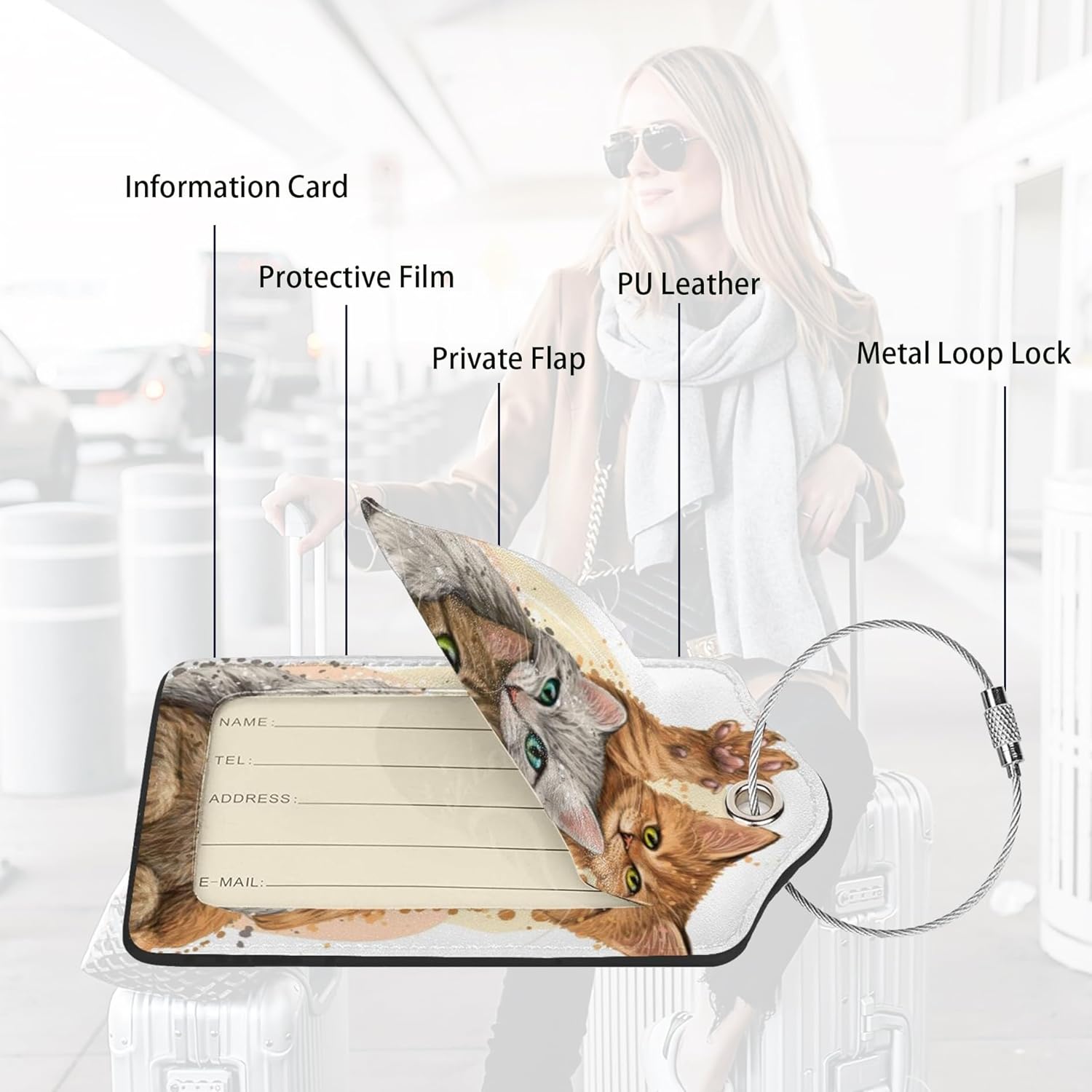 2 Pack Luggage Tags for suitcases Cute Funny cat Luggage Tag, Leather Stainless Steel Loop Label Tag for Men Women Travel Bag Suitcase(2 cat)