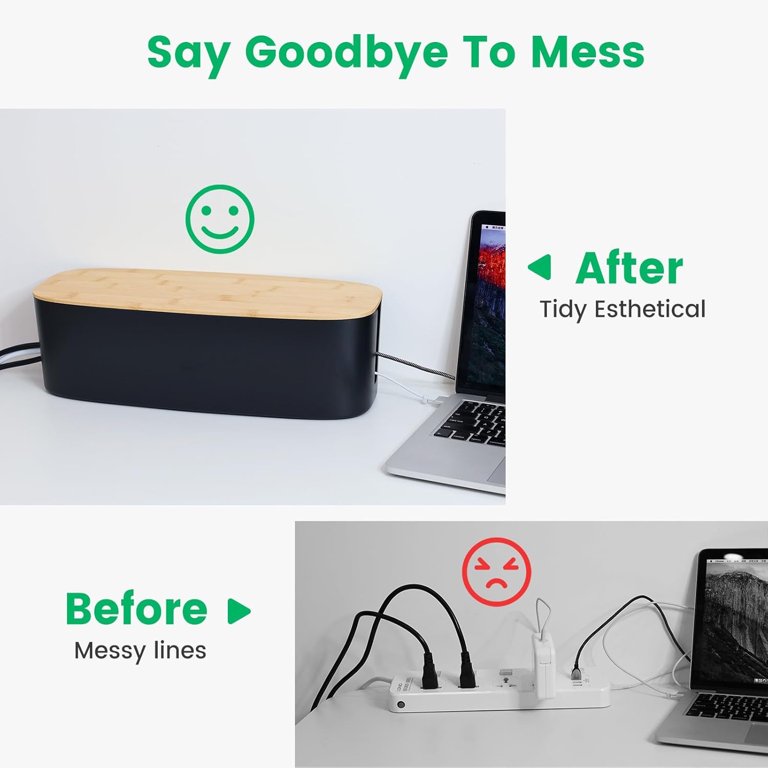 - 【VENTILATED & KID SAFE】The Wire Box Hider have 3 cable entry/exit slots to ensure ventilation. Close the bamboo lid can be a good storage messy wires and power strips, to ensure the safety of children and pets.