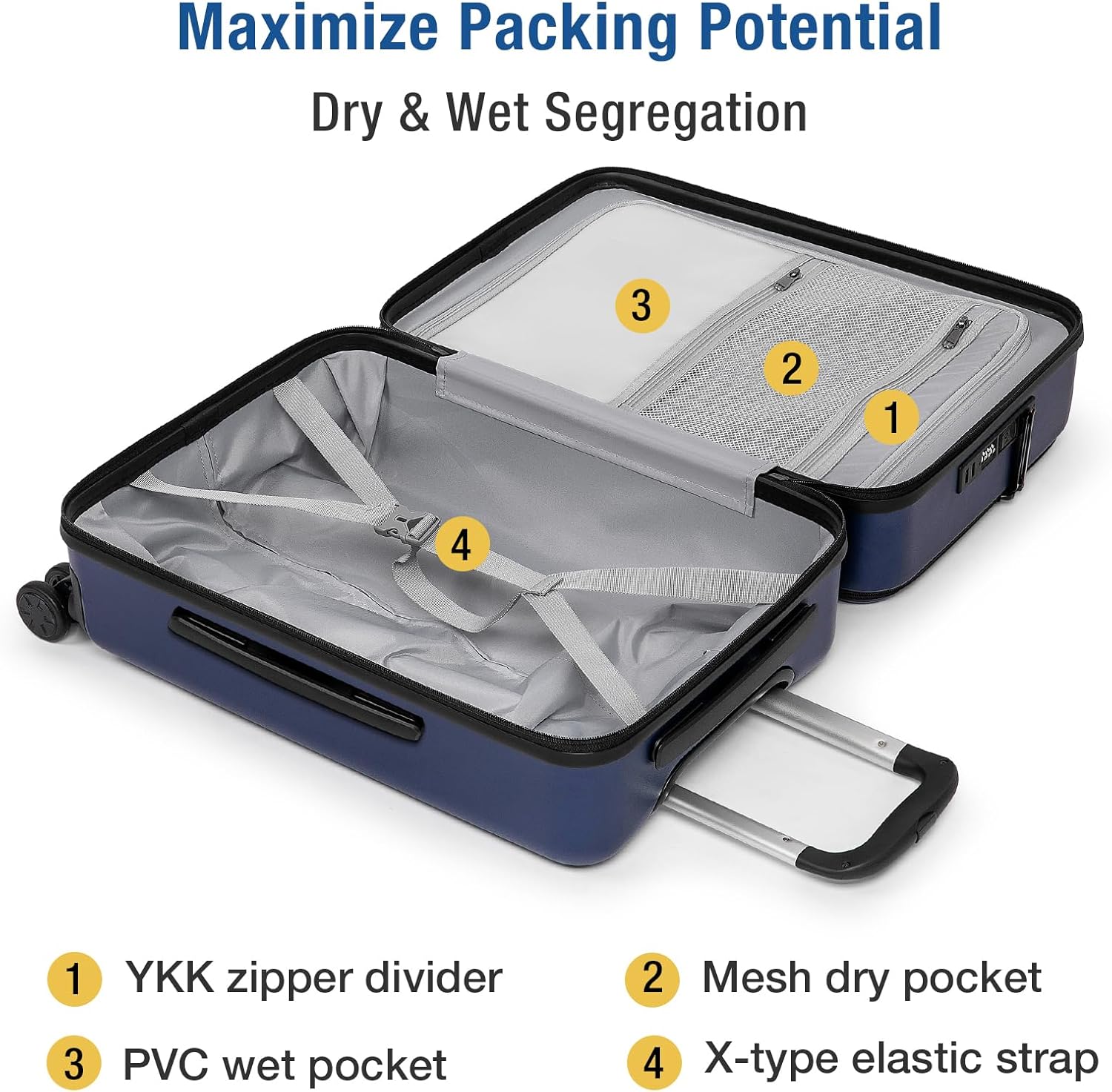 KYME Luggage Sets, 100% PC Suitcase With Double Spinner Wheels & TSA Lock, Hard Shell 3 Piece Set, 22/26/30, Navy