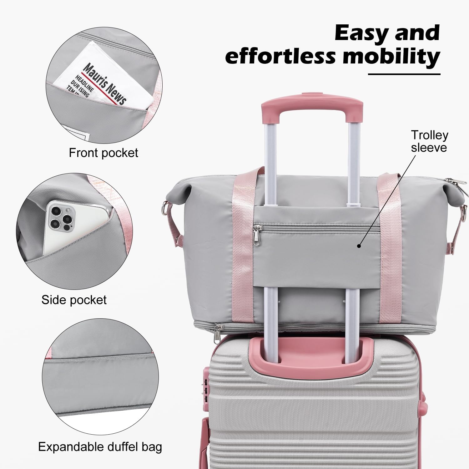 • Combinations for Various Occasions: This 3-piece luggage set comes with a 20-inch carry-on suitcase(9.4*15.7*22.6"), a duffel bag(16.1*10.2*8.66"), and a toiletry Bag(10.5*5*5.5"). The carry-on is designed to fit airline cabin size limits and can easily slide into overhead bins or underseat. Plus, the duffel bag, which has an expandable feature and a trolley sleeve, offers extra security for your items by connecting them to the pull-out handle.