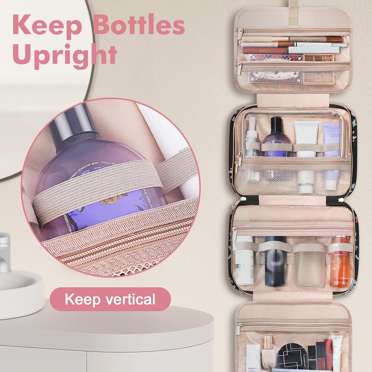 Wedama Toiletry Bag for Women, Large Cosmetic Travel Bag, Hanging Toiletry Bag for Bathroom, PVC Waterproof Makeup Bag, Toiletries Bag for Travel Business Trips and Camping, Black+Pink Floral