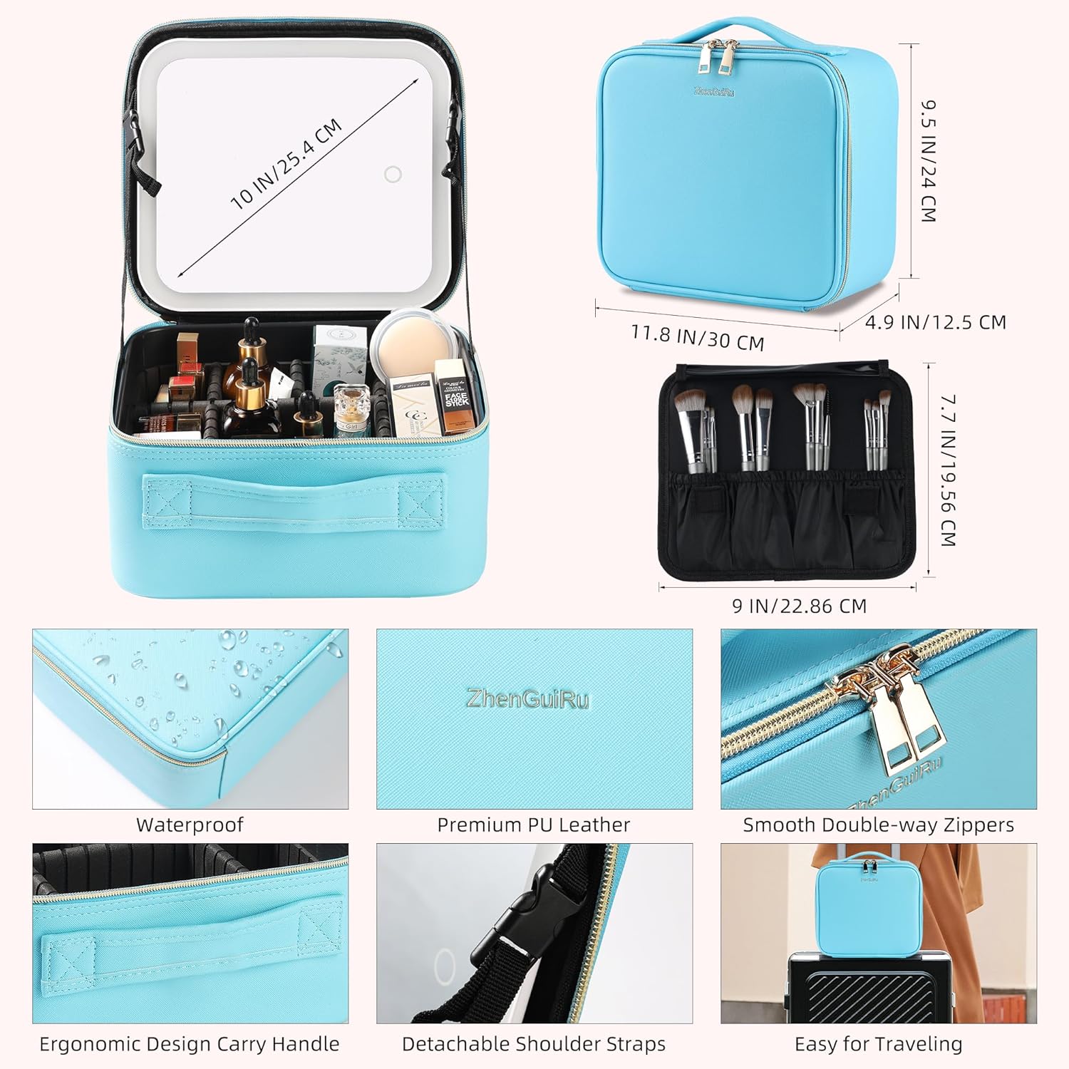 Travel Makeup Bag with LED Mirror – Waterproof Cosmetic Train Case with Adjustable Dividers, Portable Makeup Organizer and Toiletry Bag for Women, Teens & Girls Gift, Blue