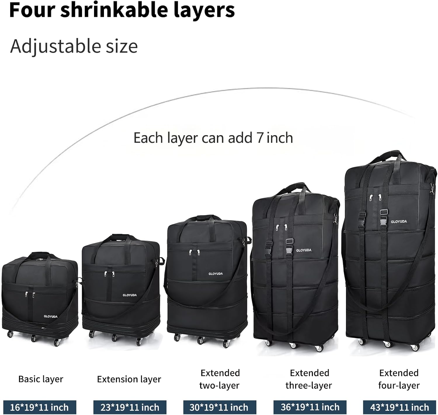- 【Expandable Dimension】There are five layers of the suitcase with wheel, the basic size of the suitcase is: 16 in (H) x 19 in (L) x 11 in (W); Each level adds 7 inches of height, All zippers opened:43 in (H) x 19 in (L) x 11 in (W). The luggage folds down to a compact 3 in (H) x 19 in (L) x 11 in (W) easy-to-store pouch when not in use.