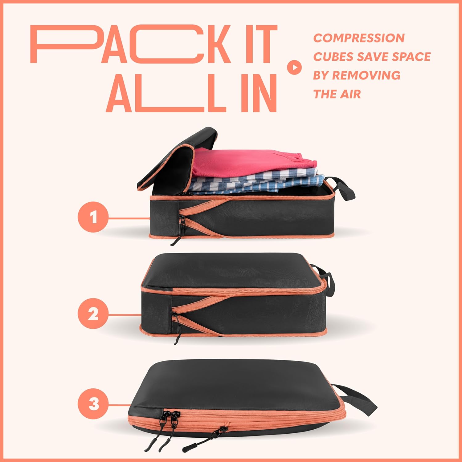 - Space Saving - Easily compress your clothes with our travel compression bags for packing, maximizing space in your suitcase or backpack. Using the outside compression zippers you can flatten the cube to save up to 50% of packing space, allowing you to pack more in to your luggage.