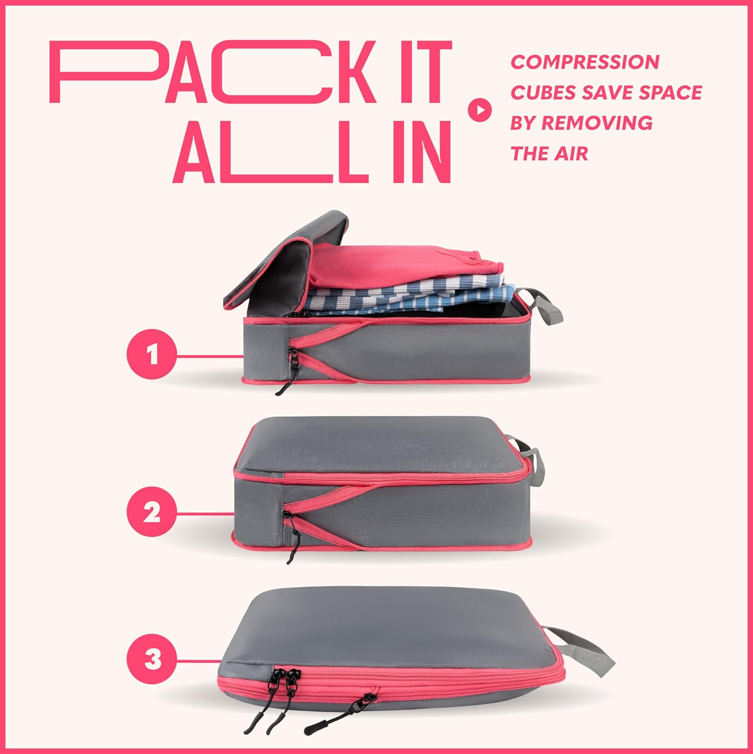 - Space Saving - Easily compress your clothes with our travel compression bags for packing, maximizing space in your suitcase or backpack. Using the outside compression zippers you can flatten the cube to save up to 50% of packing space, allowing you to pack more in to your luggage.