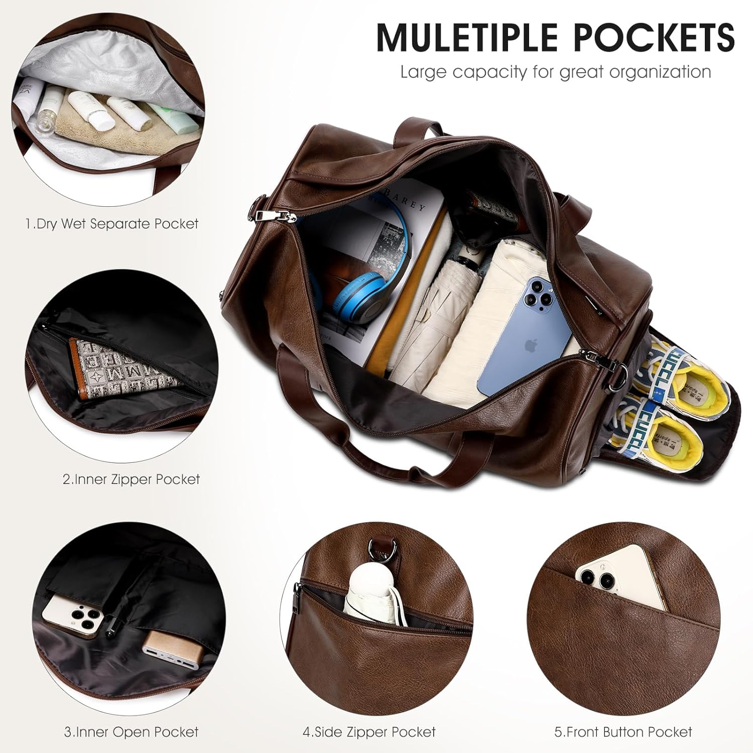 - 【Large Capacity&Comfortable Shoulder Strap】The leather duffle bags for men featuring multiple pockets and compartments for stuff organization, roomy space can fit in 3-5 days of travel essentials, easily fit into your clothes, toiletries, shoes, laptop(can hold up to 21" laptop)ipad and other items.The wide strap have a comfortable padding, which can reduce the pressure when carrying.
