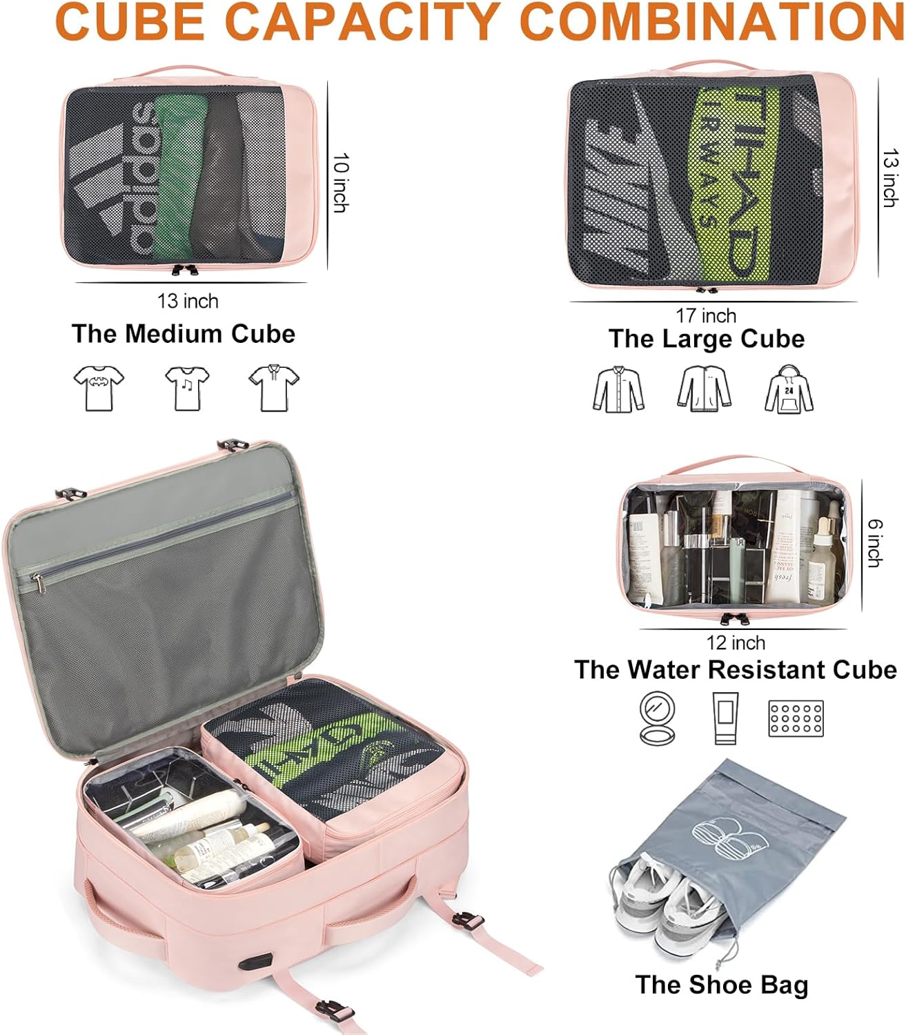 - EXTRA 3 PACKING CUBES+1 SHOE POCKET:This weekend travel backpack comes with three packing cubes. large cube and medium cube for clothes, personal item. Small water resistant cube with transparent side for providing clear overview of Toiletries. there's also a shoe pocket. Keeping your belongings neater and more organized. Serve you well as carry on bags for airplanes, weekender backpack, personal item travel bag, overnight bag