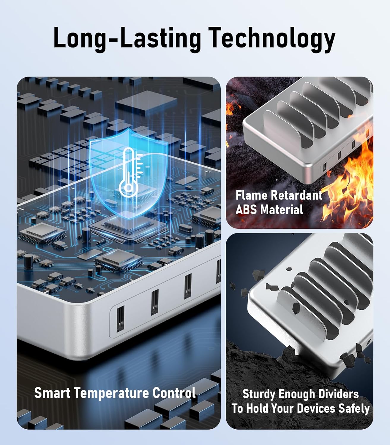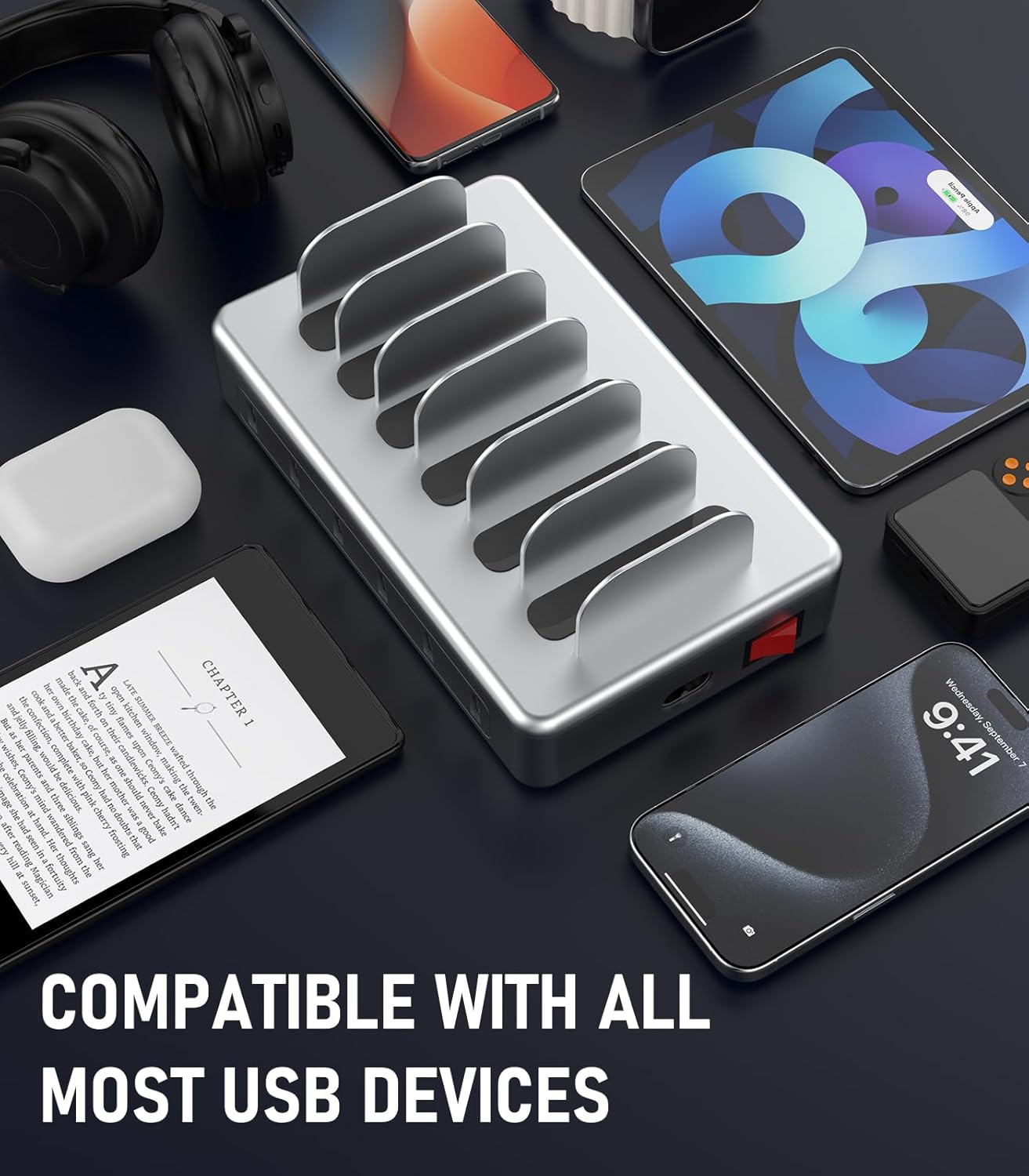 - 【Special Design】The usb charging station is in a premium silver colour. The nightstand charging station is designed with two width slots, three are 0.75 inches and the remaining three are 1 inch. The slots of different widths can accommodate different-sized equipment.It's sturdy, and not easy to collapse