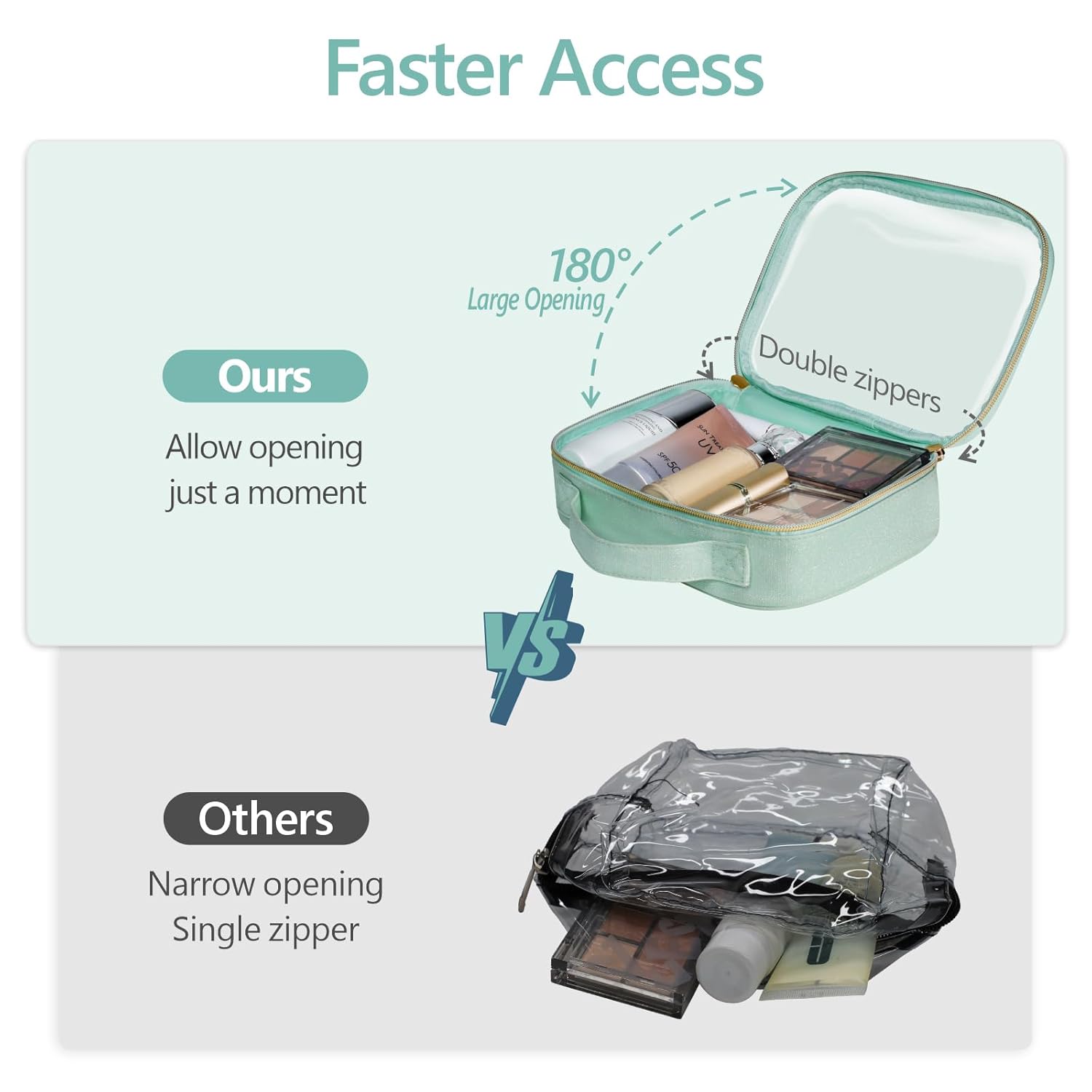- Ideal for Travel-Sized Toiletries: The clear cosmetic bag perfectly store the travel bottles for toiletries, travel size toiletries kit, and other travel essentials. TIPS TO REMOVE THE SMELL: Please first wash the outside and inside of the bag with soap and water, then unzip the bag and leave it in a well-ventilated place for a few days (for age 12 or above)