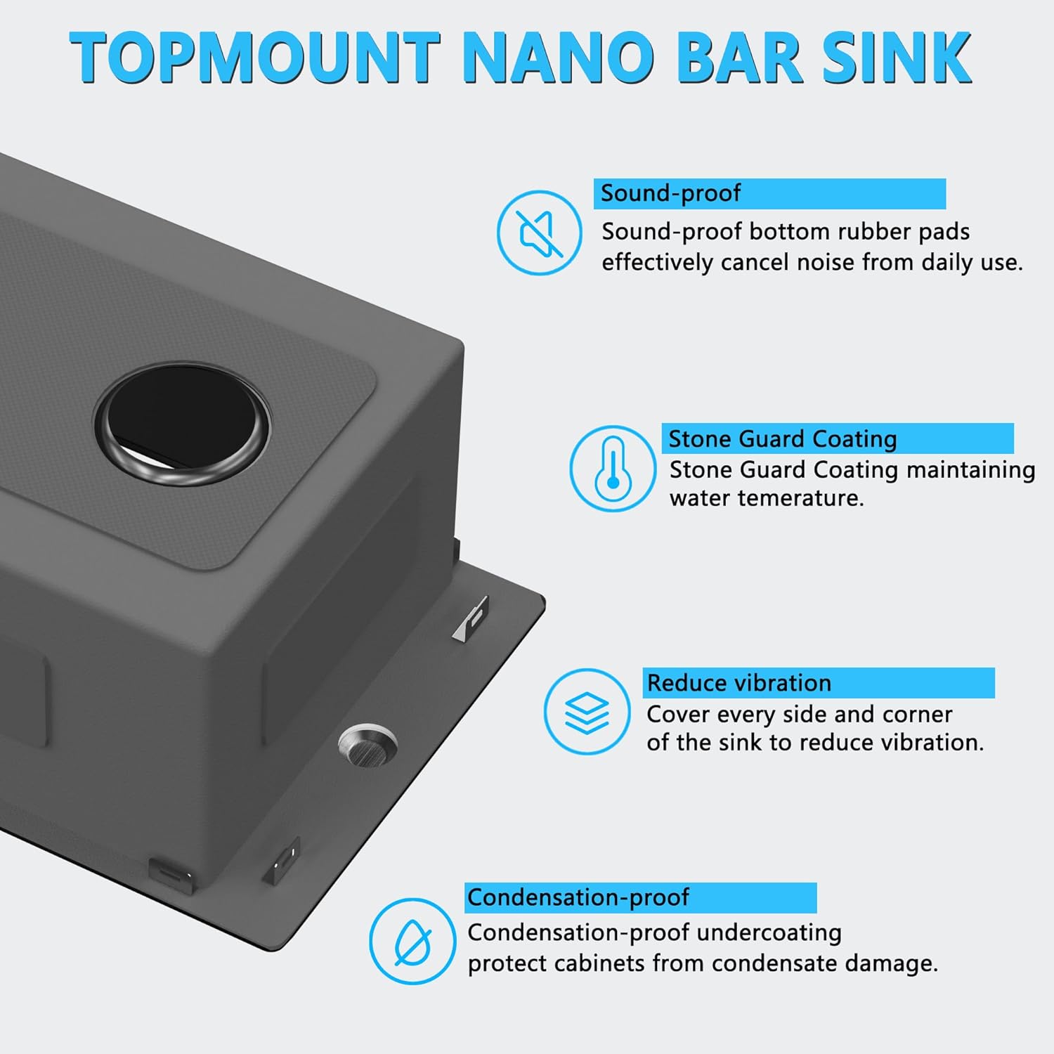 - [18 Gauge Small Kitchen Sink]: Our drop in bar sink is handcrafted by skilled artisans using premium-quality stainless steel, ensuring its durability and longevity. The special slopped bottom and X-shaped drain grooves that ensure draining water quickly and prevent water pooling.