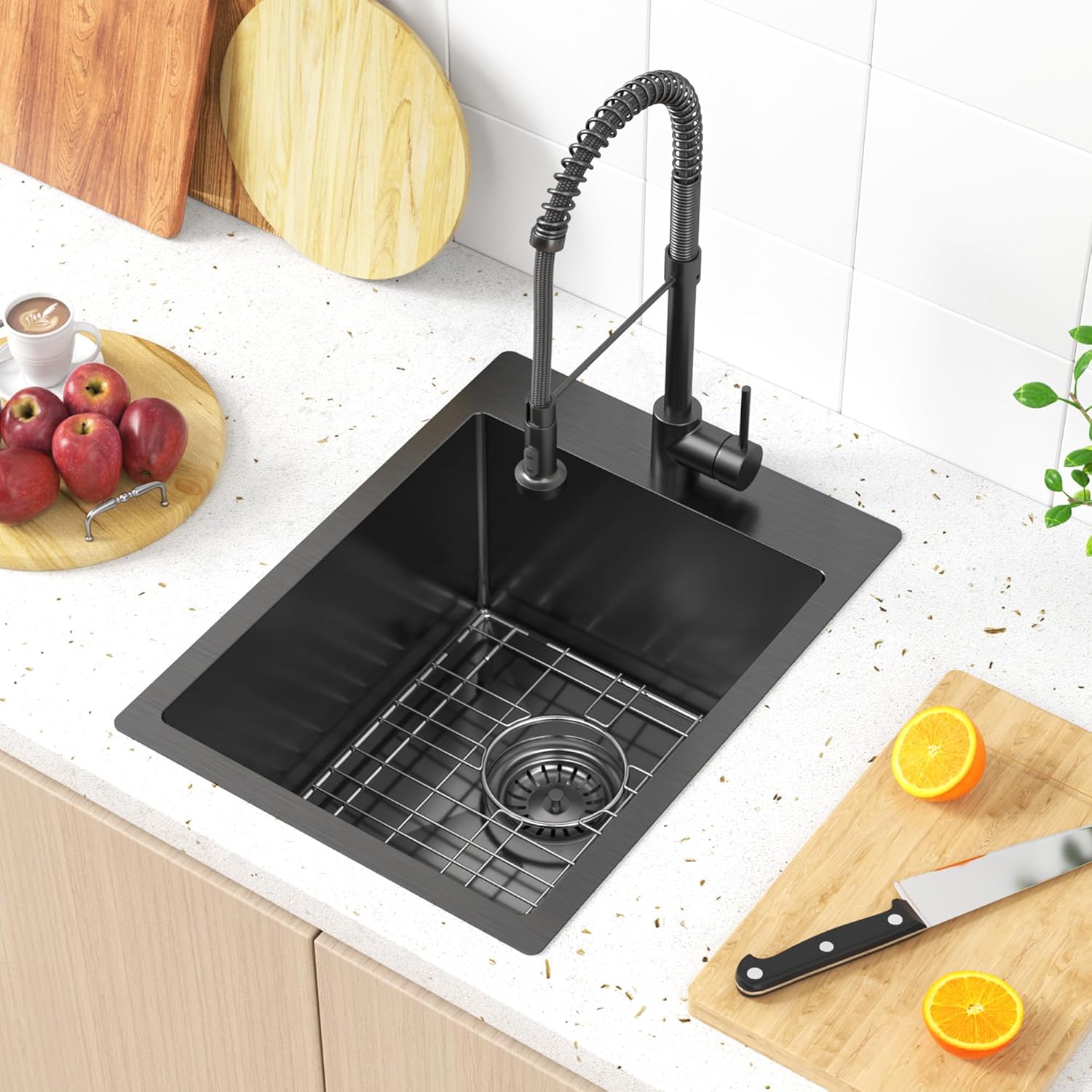 15x20 Drop In Bar Sink Black, 15 Inch Gunmetal Black Wet Bar Sink 18 Gauge Single Bowl Topmount Stainless Steel Small Kitchen Sink with Basket Strainer Drain & Bottom Grid