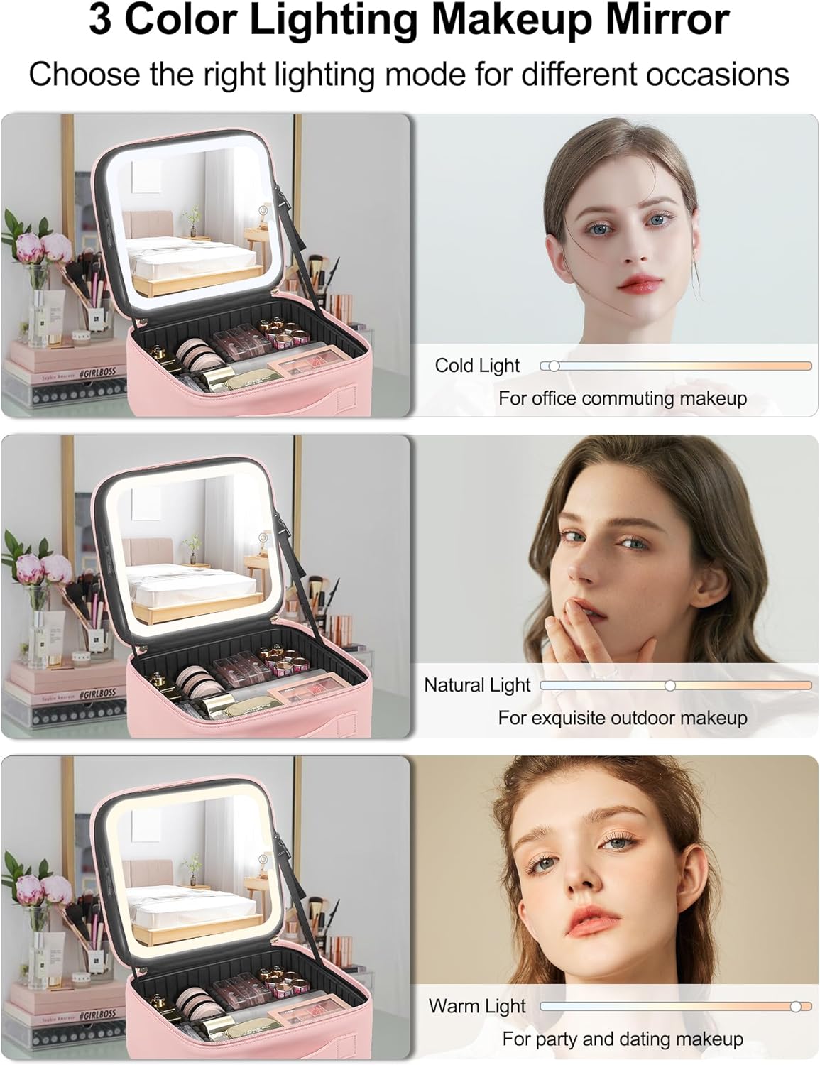 - USB Rechargeable Makeup Mirror: New generation makeup case design with LED makeup mirror, with cold white / natural / warm three-tone settings, and the brightness can be adjusted 0%-100%, which can perfectly meet your different makeup needs and make your makeup more delicate.