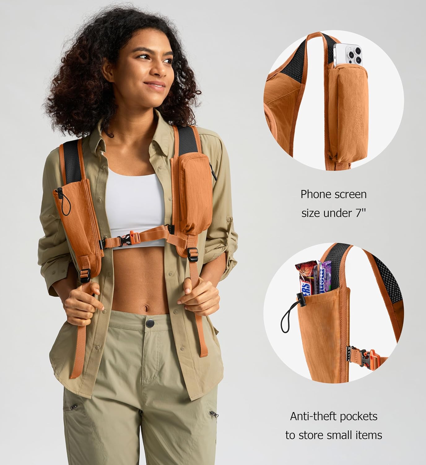 - CELL PHONE POUCH: The zippered pocket on the left shoulder strap will hold a cell phone screen up to 7 inches, and on the other side is an anti-theft pocket with an elastic cord closure, so you can put some items such as a wallet and snacks.