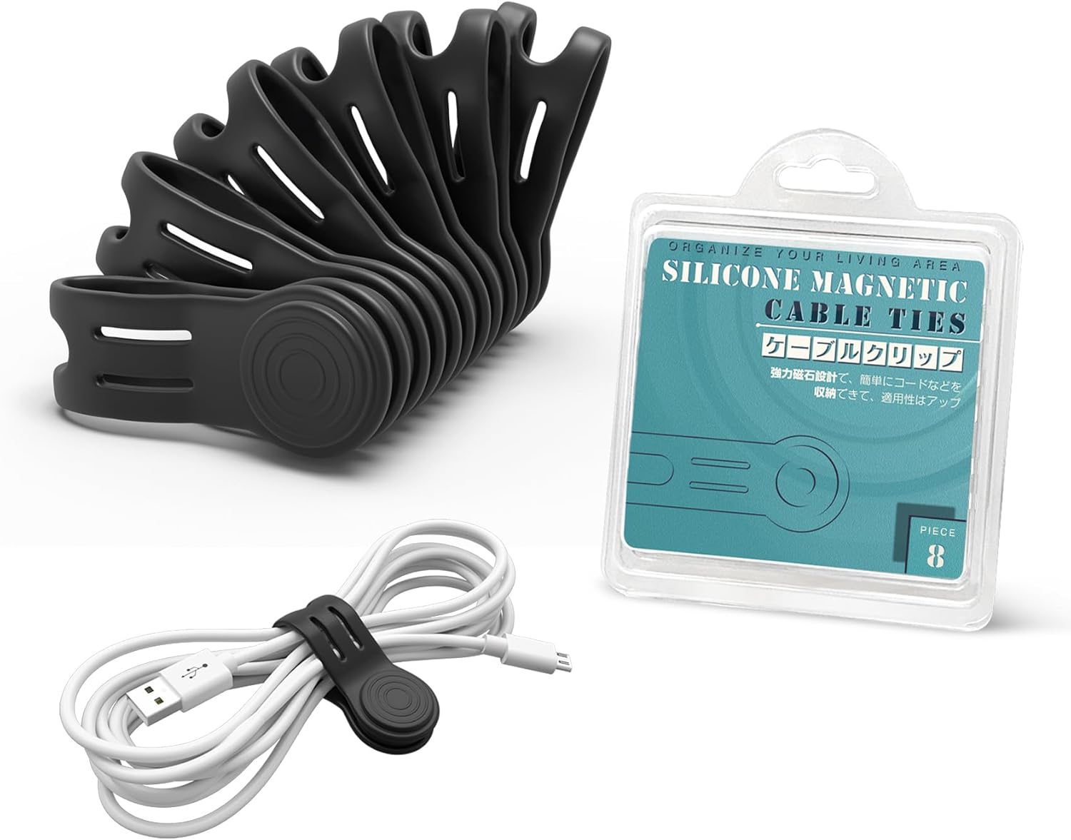 Kanemc Magnetic Ties For Cords, Cord Wrap Silicone Zip Ties Twist Ties Magnet Strap For Smartphone Charger Earphone Video Game USB C Cables (8-Pack, Black)