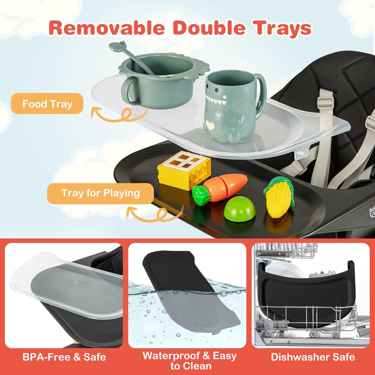 - 【Removable Double Trays】This convertible baby high chair comes with an upper food tray and a lower tray for playing. The trays are made of BPA-free & safe PP material. In addition, they are removable, dishwasher safe, waterproof and easy to clean.