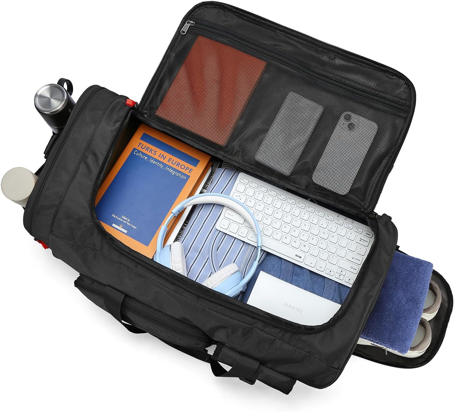 • 【Multifunctional Pockets & Design】Our duffle bag backpack has a total of 11 pockets. Includes 1 large internal mesh pocket and 2 internal zipper pockets; Outside: 2 front zip pockets, 1 flap pocket, 1 side zip pocket and 2 mesh water bottle pockets, 1 shoes compartment, 1 trolley luggage sleeve. The bottom zip pocket hides the backpack straps when not in use. And the elastic cord on top provides additional storage space for jackets or towels.