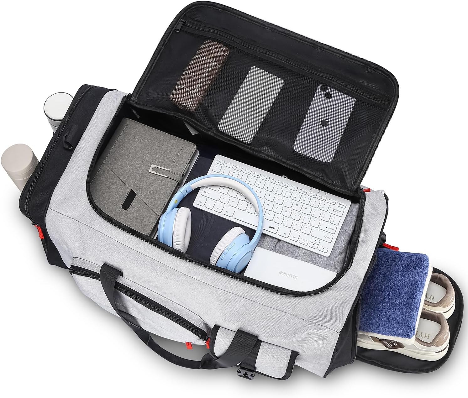 - 【Multifunctional Pockets & Design】Our duffle bag backpack has a total of 11 pockets. Includes 1 large internal mesh pocket and 2 internal zipper pockets; Outside: 2 front zip pockets, 1 flap pocket, 1 side zip pocket and 2 mesh water bottle pockets, 1 shoes compartment, 1 trolley luggage sleeve. The bottom zip pocket hides the backpack straps when not in use. And the elastic cord on top provides additional storage space for jackets or towels.