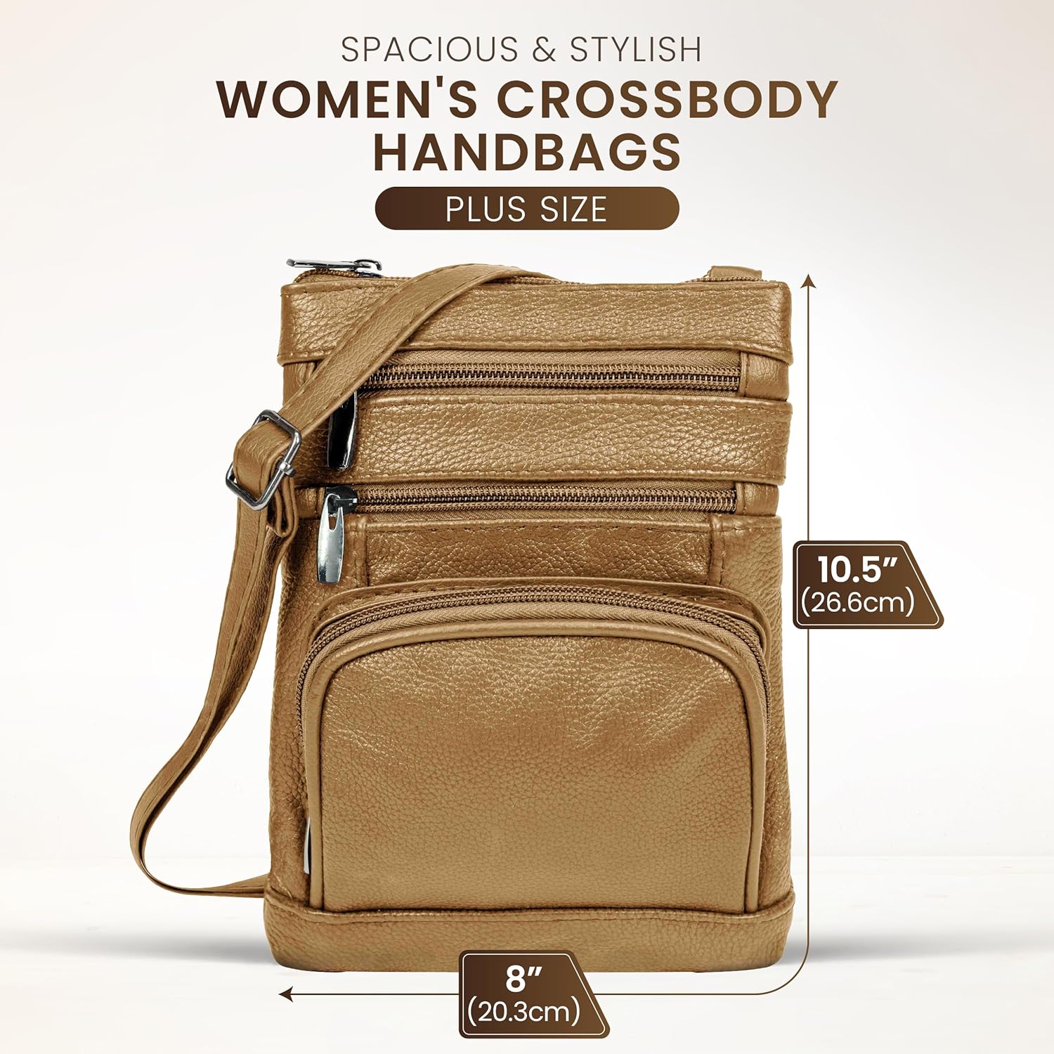 - Crossbody Purse With Unique Design - Our womens crossbody purse features 5 exterior zip pockets, including a top zippered main pocket, three front zippered pockets, one rear pocket, and a shoulder leather strap. These regular size crossbody purses for women have dimensions: 10.5" (height) x 8" (width).