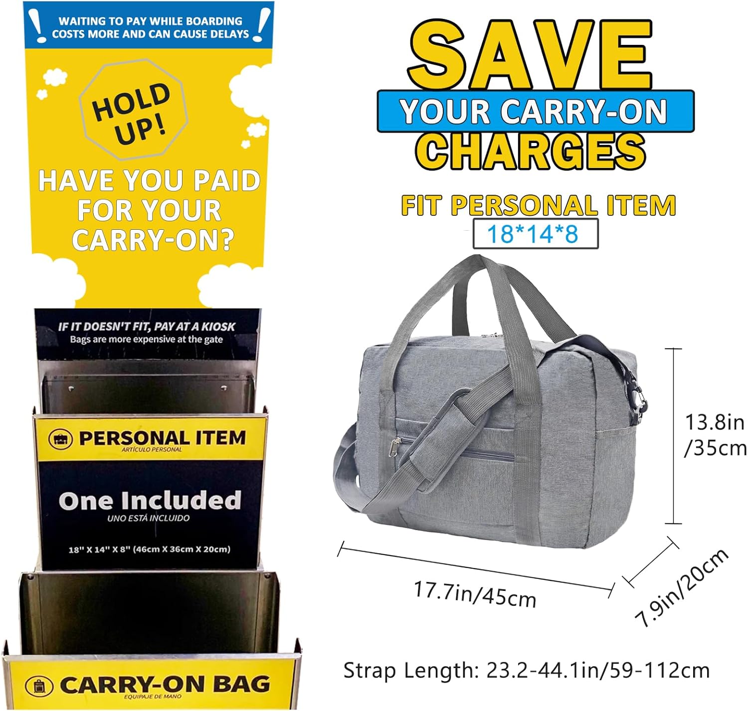 - Perfect Size: The travel bag is available in two sizes, 18 x 14 x 8 in (capacity 30L) and 16 x 10 x 8 in (capacity 20L). A wide range of airline travel bag regulations apply. This bag fits under your seat to help you avoid excess baggage charges.