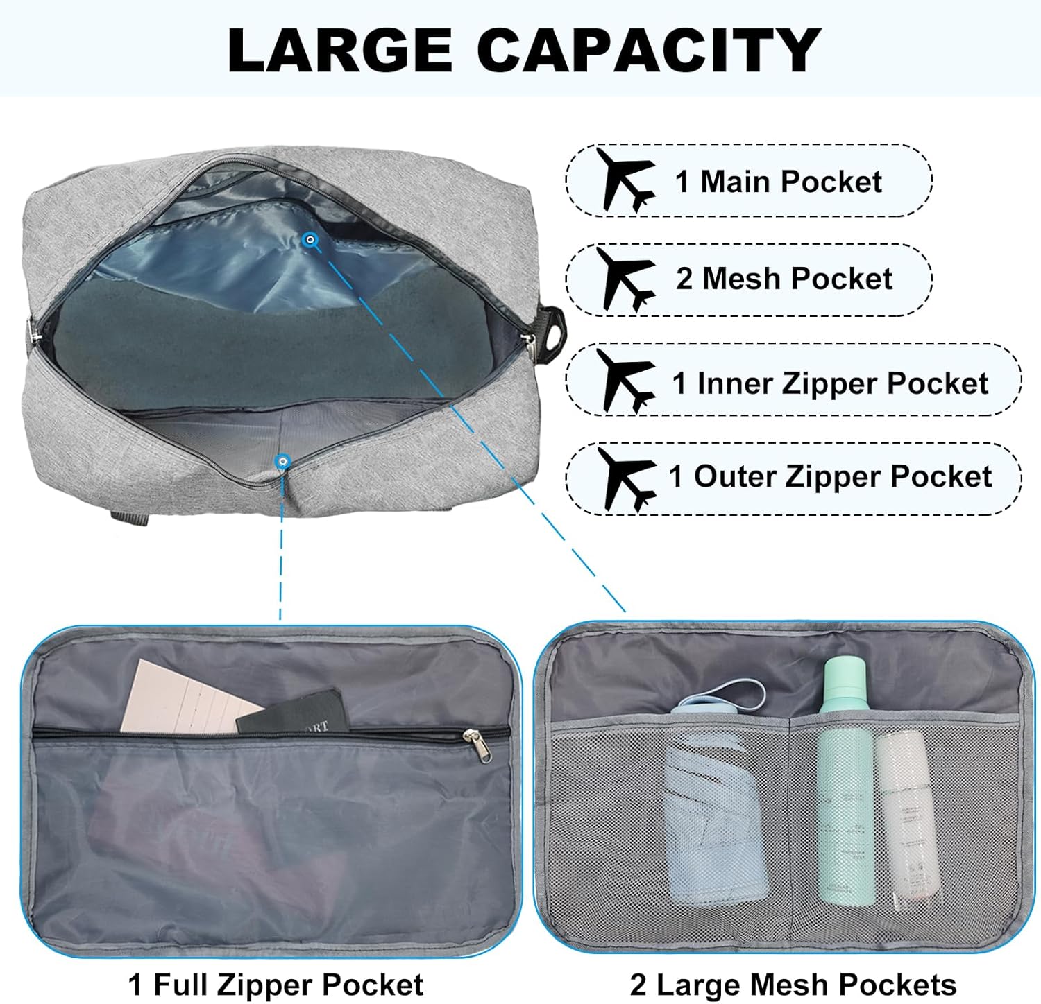 - Multi-functional: the airplane bag has one zipper pocket on the outside for storing important items and frequently used items. The interior has one zippered pocket on one side and two mesh pockets on the other side. Ideal for travel bag, hospital bag, overnight bag, weekend bag, garment bag, sports bag.