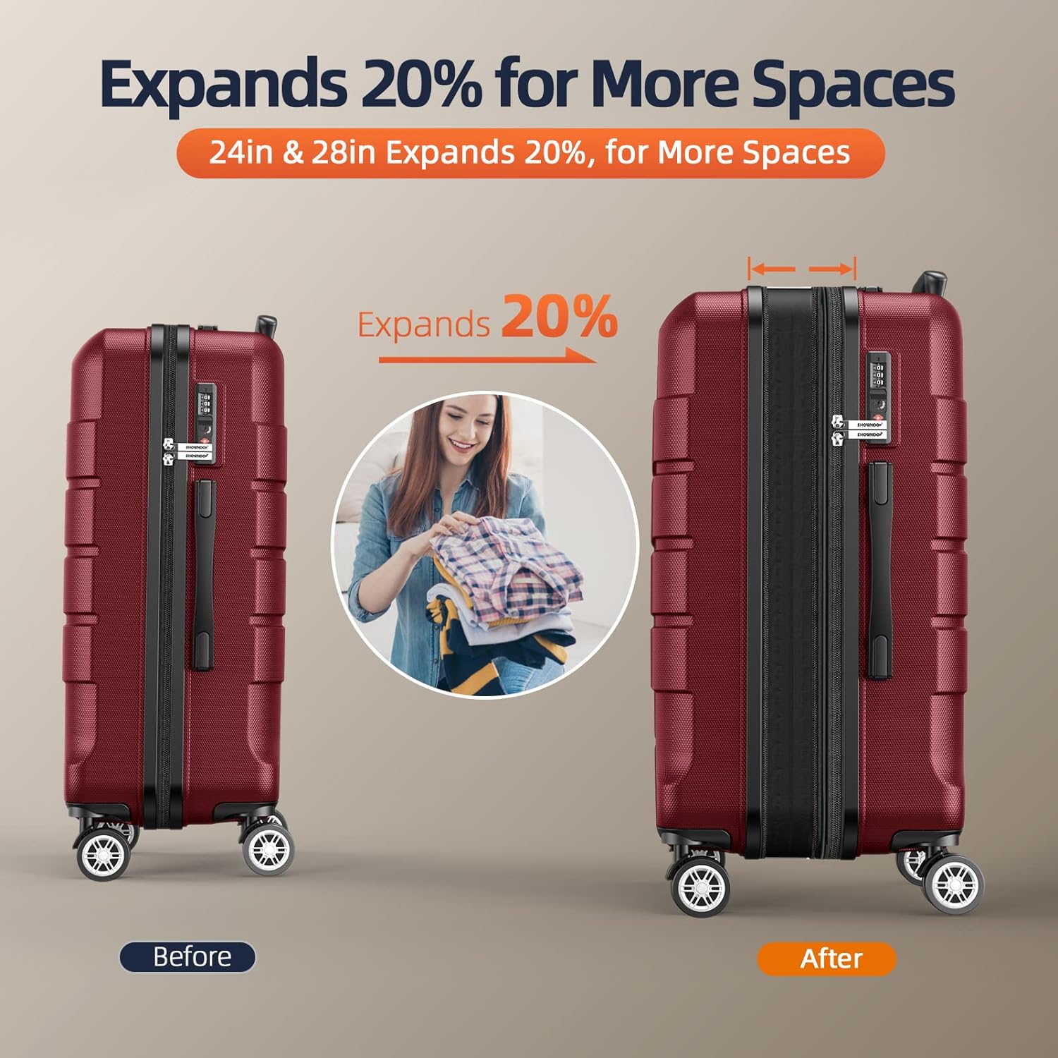 - Top Quality Luggage Sets: Made of brand new extra-thick PC+ABS materials for hardshell, which make the luggage more durable, lighter and impact-resistant. Features textured finish to prevent against scratches, keeping cases beautiful after a trip. The 5-piece luggage set offers a 20'' carry-on suitcase, a 24'' checked suitcase, a 28'' large suitcase, a duffel bag and a toiletry bag.