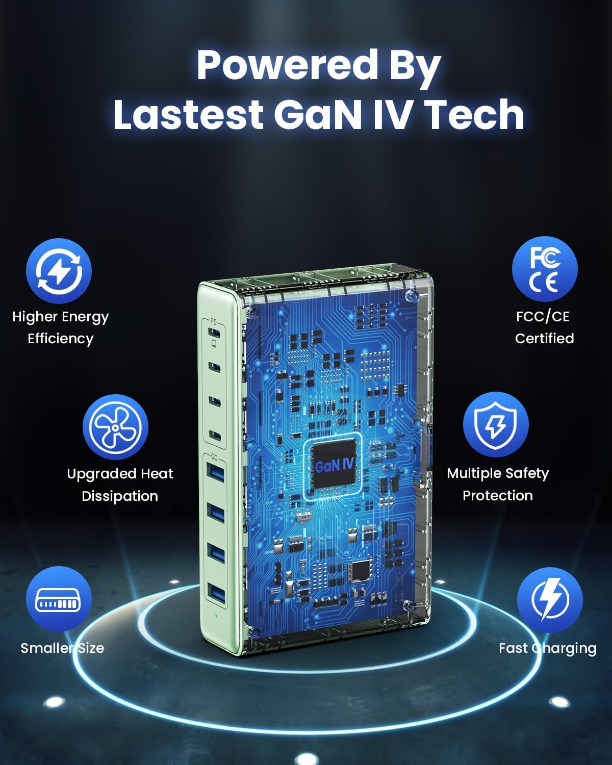 - 【Super-Fast GaN IV USB C Charger】The Latest Design USB Charger with 200W Total Power and Multiports, adapted GaN IV generation chip technology, higher resistance to radiation, longer-lasting life, upgraded heat dissipation, faster, smaller and safer without sacrificing a drop of power. The usb ports upport advanced PPS,PD3.0 and QC4.0 technology. It built-in advanced intelligent controlling IC and multi-protection safety system to ensure safety for you and your devices.
