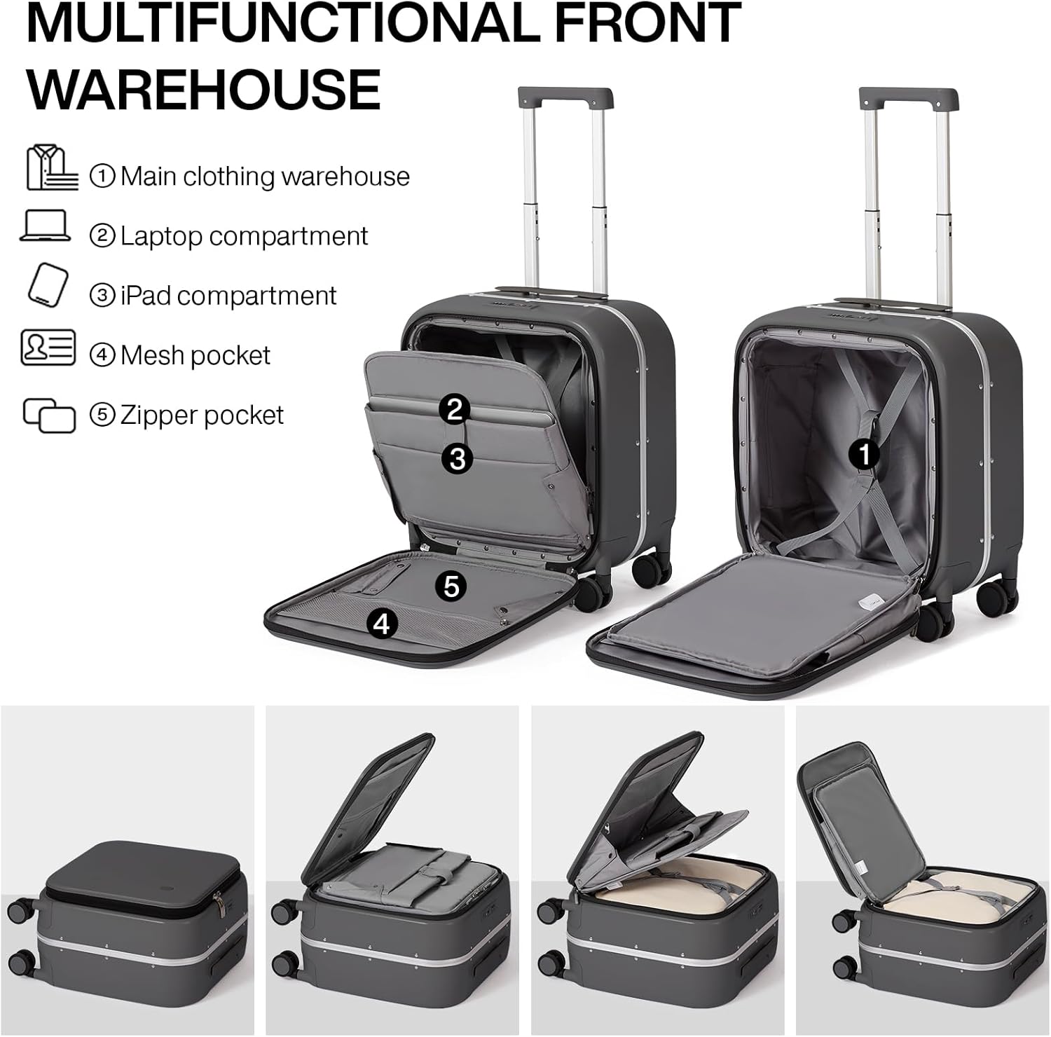 mixi Carry On Luggage, 18” Suitcase with Front Laptop Pocket, Travel Luggage Aluminum Frame PC Hardside with Spinner Wheels & TSA Lock and Cover (Not for Underseat), Rock Gray