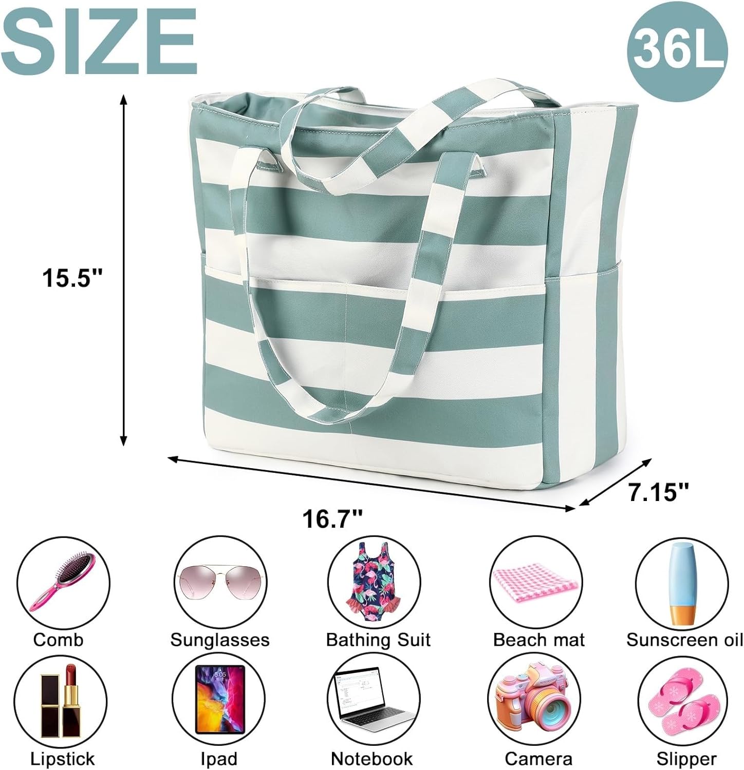 - 【Large Capacity】Beach Tote Bag Dimensions: 17.3"(L)*15.7"(H)*7.9"*(W). It is roomy for your outfits, towels, lotions, makeups, water, magazines and other accessories. The padded handles can help you carry the bag easier.