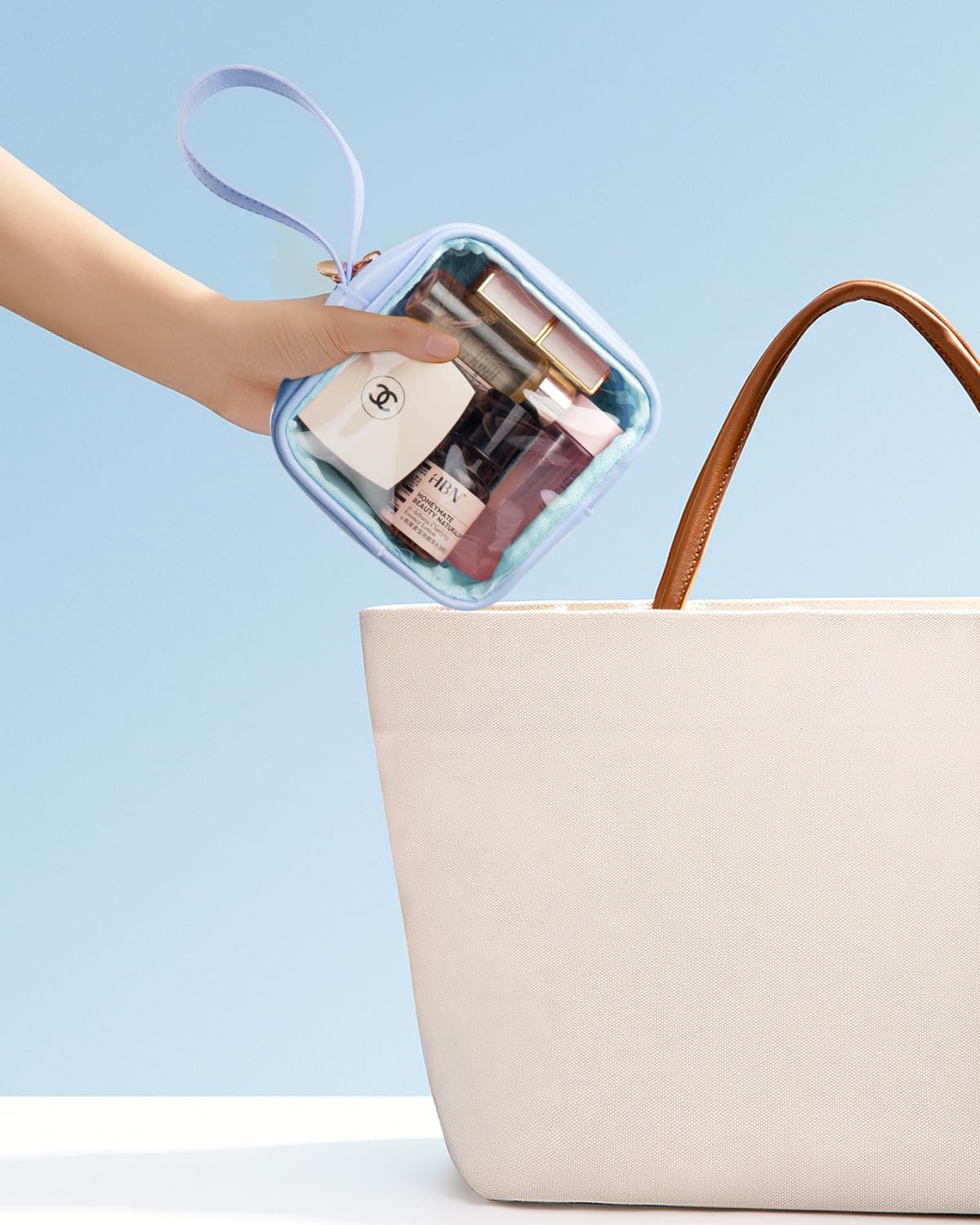 - ✈️CLEAR MAKEUP BAG TRAVELING: Clear makeup bag are transparent and durable, eco-friendly Waterproof material to see and get items quickly. the PVC material is also waterproof, Design with translucent material and double large opening zipper, allows you to see what is stored and where it is and making it convenient to pack and save time to find what you need. if your have cosmetics on your bag, it will be very easy to clean, to keep your travel bags neat and clean.
