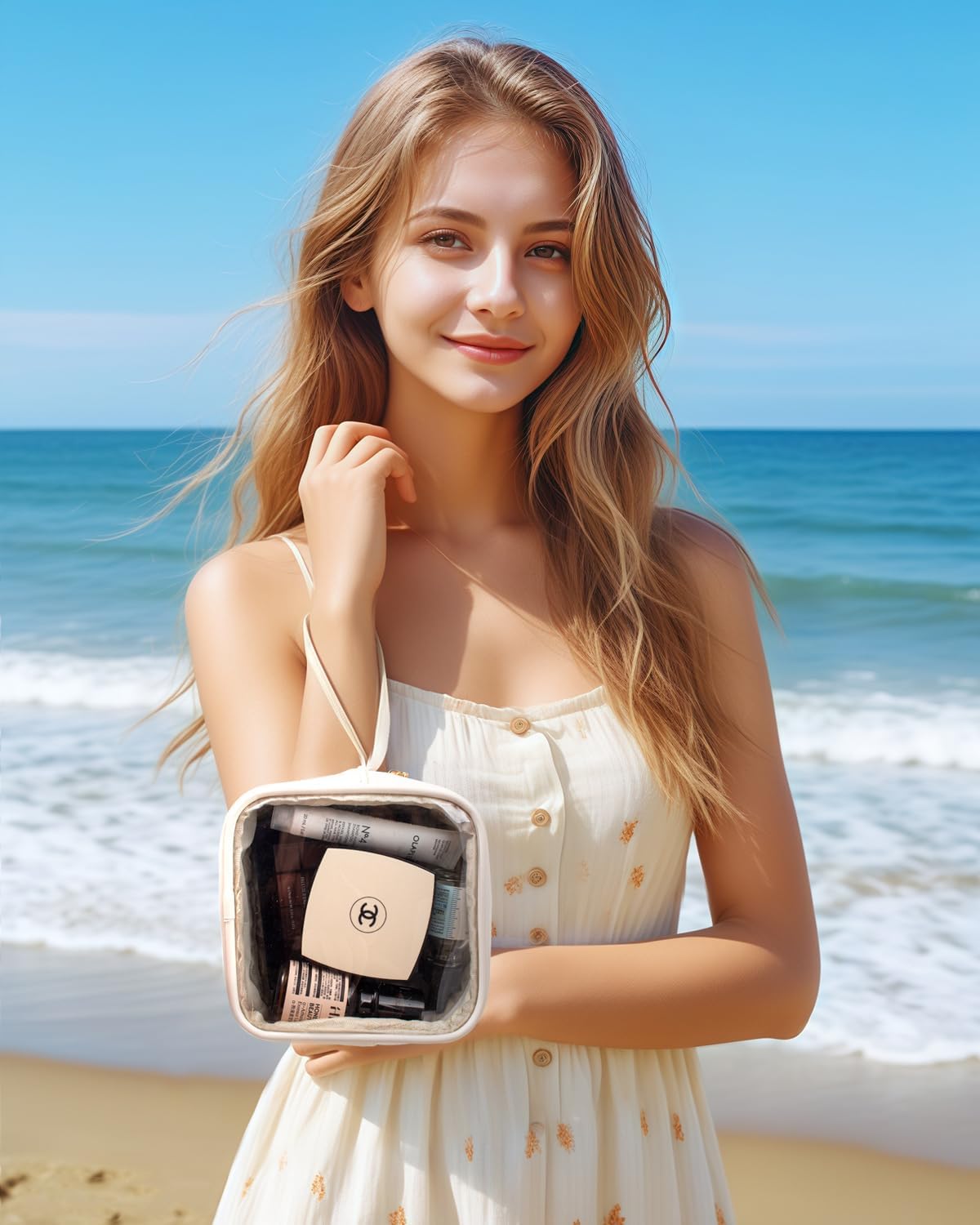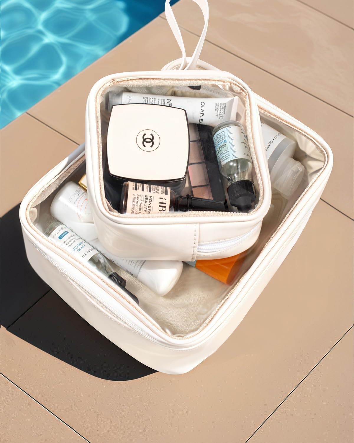 - ✈️CLEAR MAKEUP BAG TRAVELING: Clear makeup bag are transparent and durable, eco-friendly Waterproof material to see and get items quickly. the PVC material is also waterproof, Design with translucent material and double large opening zipper, allows you to see what is stored and where it is and making it convenient to pack and save time to find what you need. if your have cosmetics on your bag, it will be very easy to clean, to keep your travel bags neat and clean.