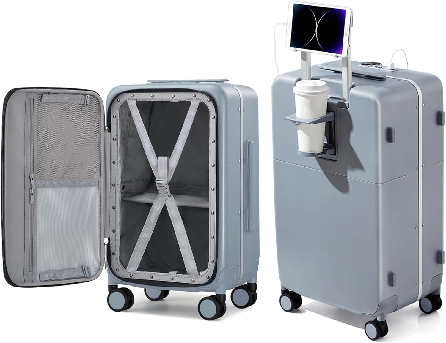 Hanke 24 Inch Luggage with Cup Holder and Charge,Top Opening Hard Shell Suitcases with Wheels and Dividers,Aluminum Frame Trunk Luggage Medium Checked Suitcase with Lock for Travel,Gray