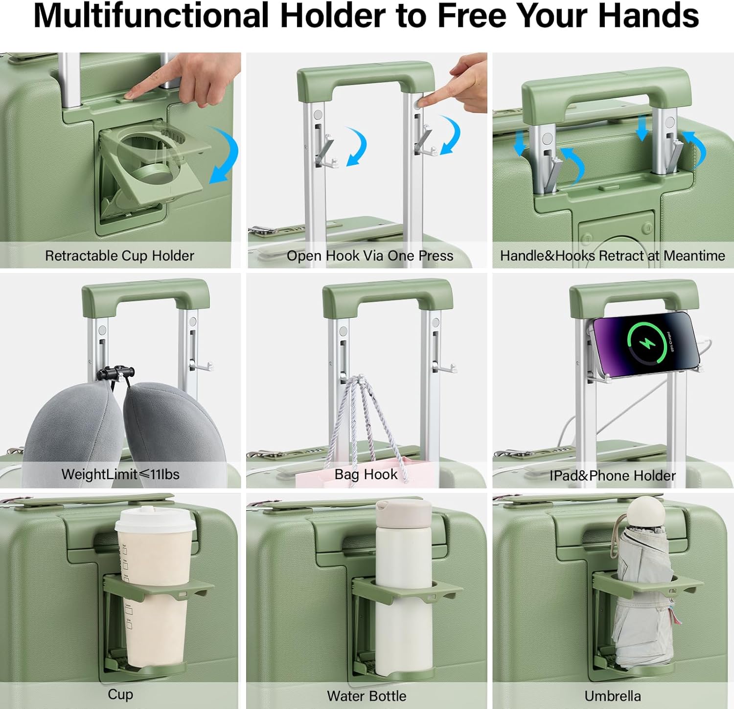 - 【Multifuctional Holder】This suitcase with cup holder is convenient to place drinks, water bottle, etc. And amazingly the hard case luggage has a phone/IPAD holder on the handle and it also be as a hook while traveling to hang your bag, U-shaped pillow.