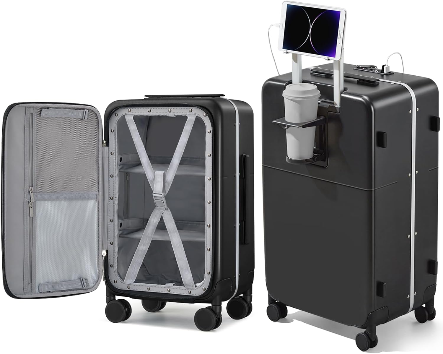 Hanke 28 Inch Luggage with Cup Holder and Charge,Top Opening Hard Shell Suitcases with Wheels and Dividers,Aluminum Frame Trunk Luggage Extra Large Suitcase with Lock for Travel,Jet Black