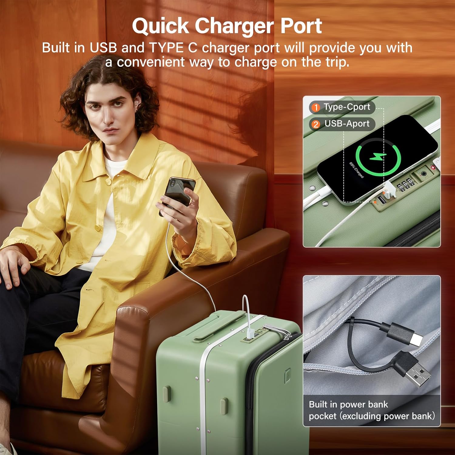 - 【Quick Charger Port】This medium luggage with charger built in USB and TYPE C charger port,you only need to connect the power bank to the cable in the pocket inside and the travel suitcase will provide you with a more convenient way to charge your electronic devices on the trip.