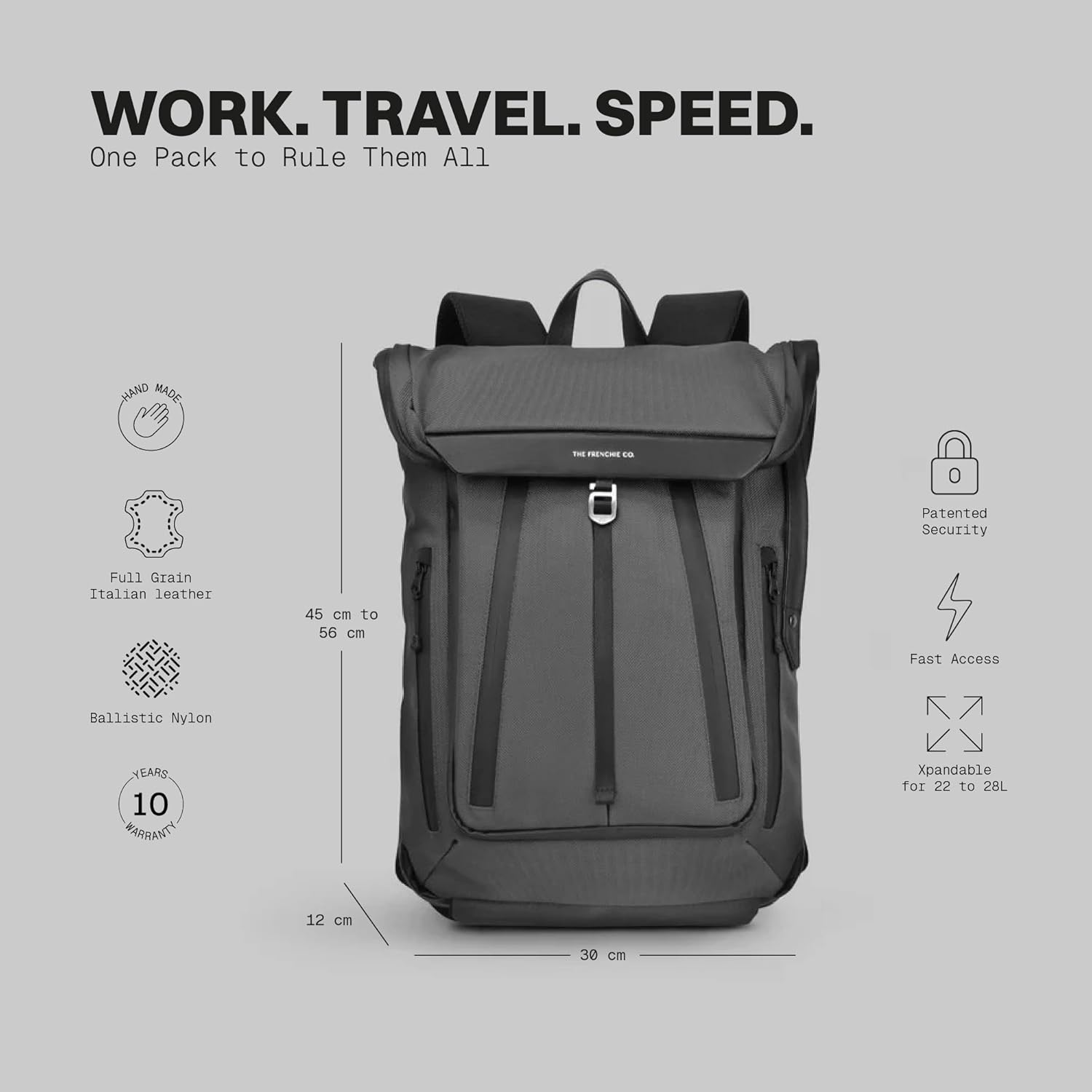 The Frenchie Co. - Work/Travel Speed Backpack - Expandable 23 to 30 liters - Anti-theft magnetic closure - Ballistic nylon with padded laptop compartment and minimalist professional design