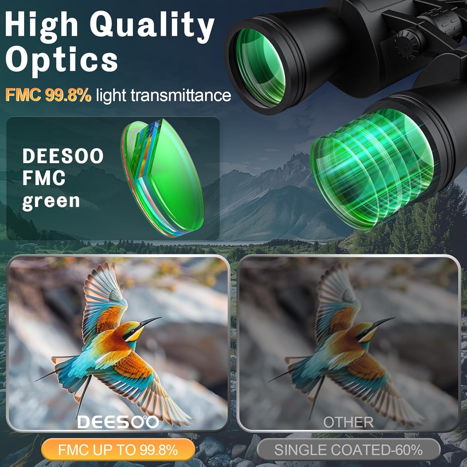 - 【20x Professional High Powered Binoculars】Deesoo outdoor binoculars feature a 20x magnification and 52mm large objective lens with a field of view of 168 feet /1000 yards, allowing you to focus on great detail at 1000 yards, providing clear and bright images.The size of the 26MM eyepiece is more in line with the structure of the human eye, preventing eye fatigue after prolonged viewing.