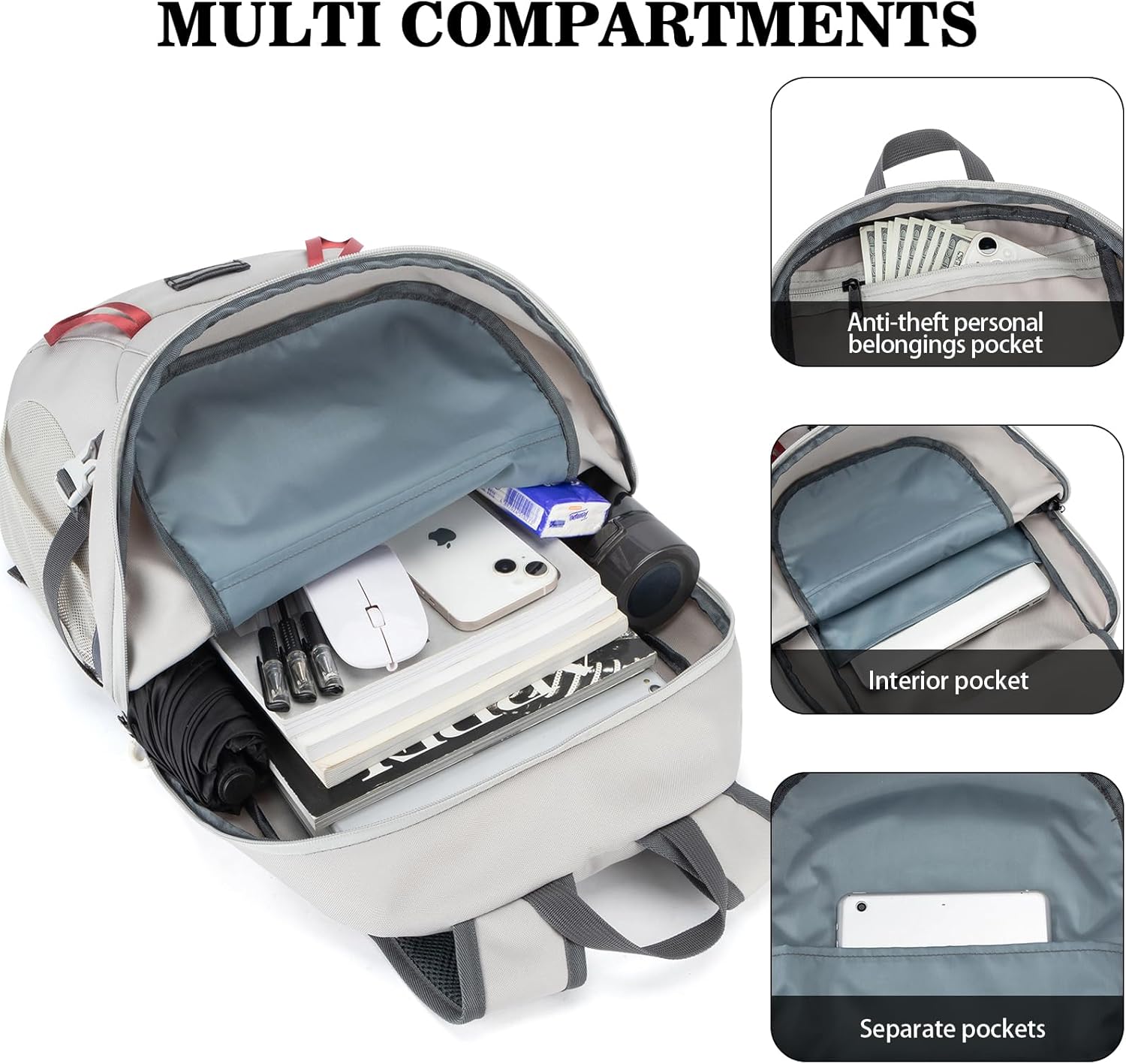 - Multipurpose:This large capacity backpack provides enough space for outdoor travel, camping, hiking, day trips and shopping. The main pocket is Large enough to hold books and clothes. An inner zippered pocket is a perfect place for travel essentials such as cash, credit cards, and passport. Two large sides mesh pockets for water bottles or umbrella