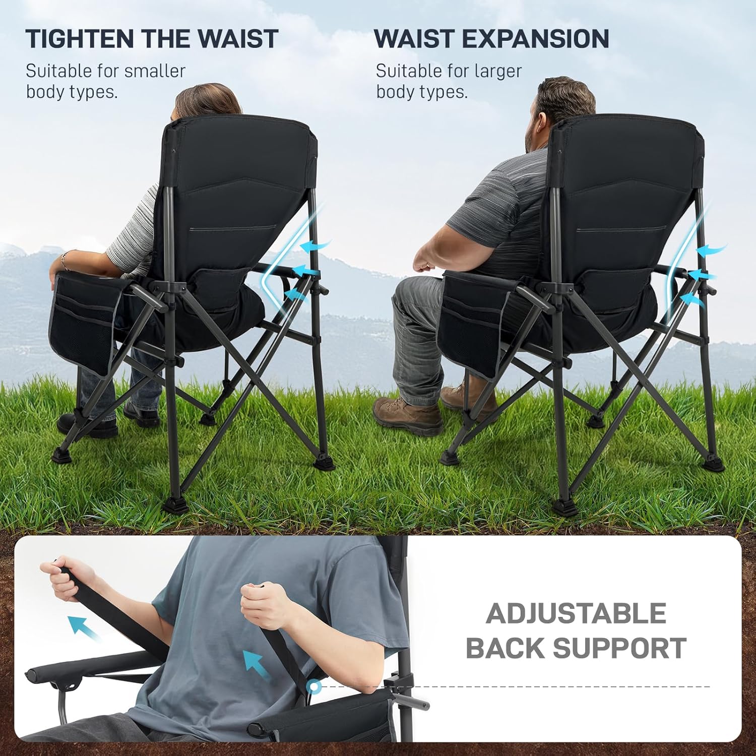 - 【HEAVY DUTY COMFORT】: Our xl camping chair is made with a heavy duty steel frame and can support up to 500lbs. Equipped with hard armrests for getting up easily.