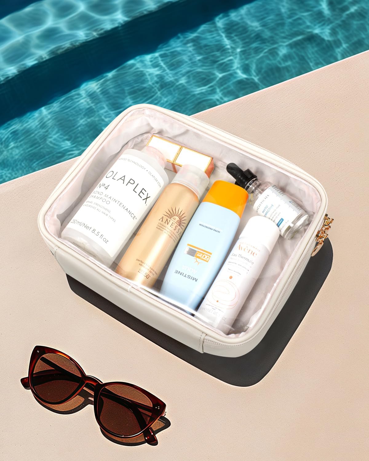 - ✈️CAR MUST HAVE ESSENTIALS CLEAR MAKEUP BAG : Large Size Measuring 9.84'' x 7.67'' x 3.14''(25cm x19.5cm x 8cm), Mini Size 5'' x 4.7'' x 2''(12.7cm x 12cm x 5cm), our clear makeup bag is elegant ,and stylish, this makeup travel organizer was designed in a minimalist boxy shape and Crafted in beautiful PU leather and finished with polished hardware, the trendy makeup bag is easy to carrying in your handbag or carry-on.